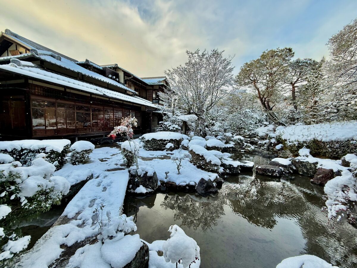 世界遺産『下鴨神社』からすぐ。三井財閥10代目・三井高棟が自ら設計に関わった国指定重要文化財の近代和風建築と庭園の雪景色。