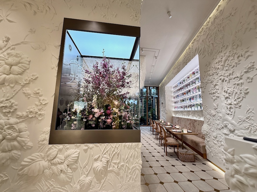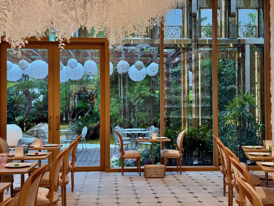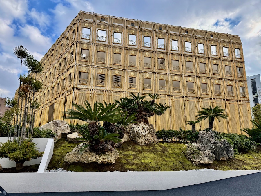 約1,800平方メートルの敷地の中心は、夜には金色にライトアップされるその豪華絢爛な建築。パリの本店『30モンテーニュ』のファザードを、京都・嵐山の竹林から着想を元に再解釈/再構成されたもので、まるで本物を竹を金色に染色した…?ようにも見えるアルミニウム製の“竹”で組まれています。そして内装もほぼ全面に日本の和紙(京都や越前)が用いられ、その特徴的な曲線も青森のねぶた(ねぷた)から着想されているそう。