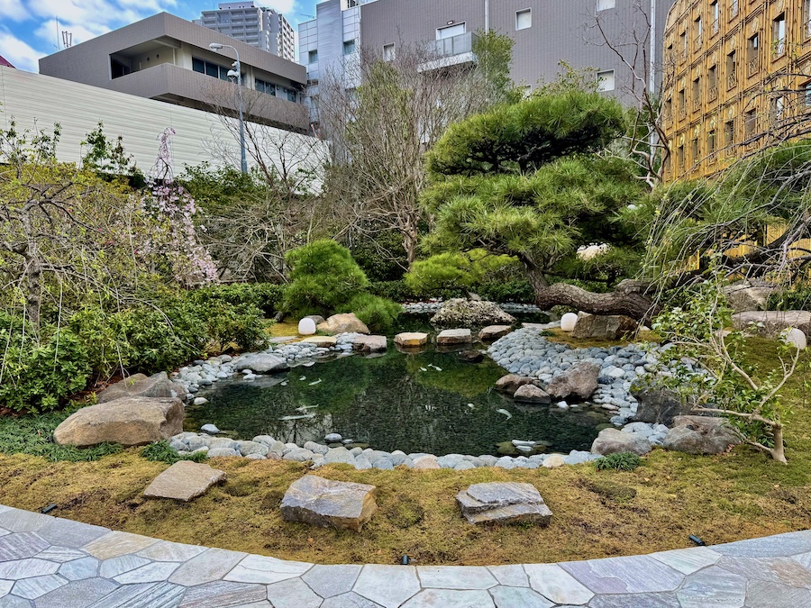 宮殿の様な雅な建築と、洲浜のある平面的な庭園といった組み合わせ——様式で言うならば平安時代以前…例えば『平城京東院庭園』の様な趣き。その一方で、エキゾチックなソテツや京風な台杉など、無国籍・グローバルであり自由な雰囲気がこの空間の魅力!(ガラスの鯉もすごい…!)