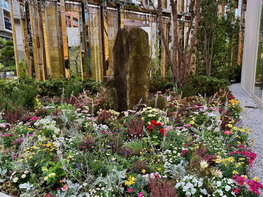 その先、アプローチから隠れた坪庭的な空間に入った途端にカラフルな世界観に誘われて驚く…!こちらのガーデンの植栽を手掛け、予約制の『カフェ ディオール by アンヌ=ソフィ—・ピック バンブーパビリオン』に作品「ブロックフラワー」「パルダリウム」を展示されているのがフラワーアーティスト・東信さん(花樹研究所)。先のガーデンはブランド創始者:クリスチャン・ディオールが幼少期を過ごしたフランスのノルマンディー地方・グランヴィルの庭園をイメージして作庭されたもの。
