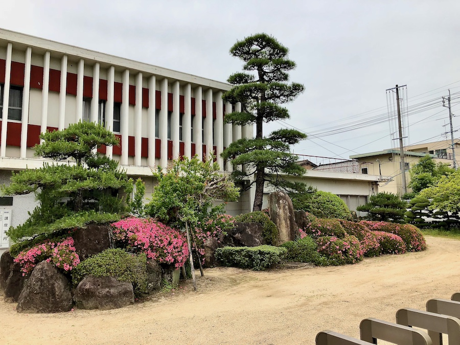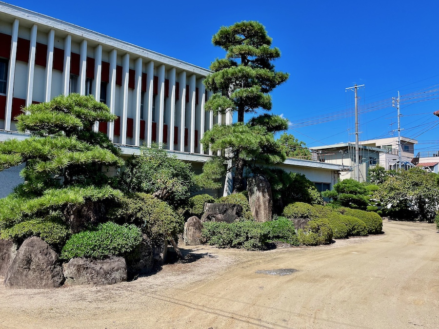そんな矢掛の町家の庭園を色々紹介してきましたが…実は、昭和の人気作庭家・重森三玲がデザイン/構想した庭園が。『やかげ郷土美術館』に隣接する昭和レトロな建築『江尻記念館』。普段は(町民の利用がない時には)カーゲートも閉まっており案内板も無いので、一見すると個人邸かな…?といった感じなのですが、現在は矢掛町有の集会施設/生涯学習施設等として活用されている建物。元は大正時代~昭和時代に掛けて矢掛の地域医療を支えた医師・江尻悟さんが運営した旧『江尻内科』だった建物。氏が亡くなられた後、御遺志によって矢掛町に寄贈され1998年より町有施設として活用。