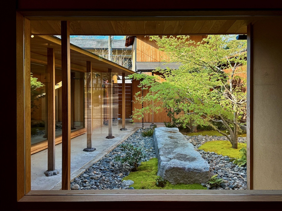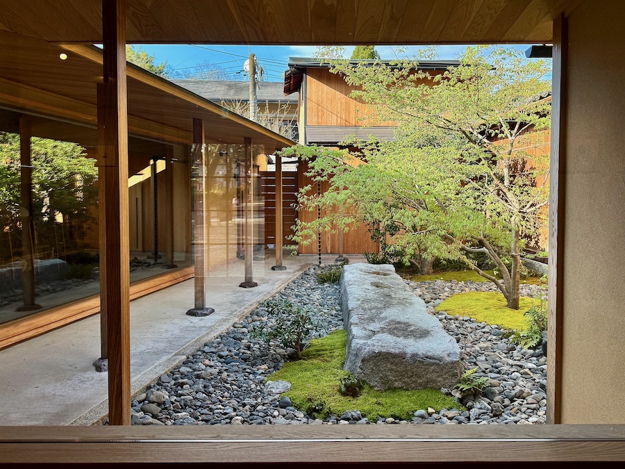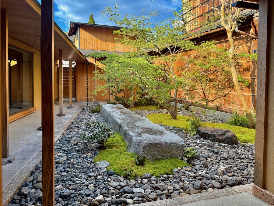 お庭の中央に配された大きな長方形の巨石がとにかくインパクト大の枯山水。この一枚岩で流れが表されている(『円山公園』の植治の流れに対する令和の庭師のアンサー!)…とモダンな雰囲気を醸す一方で、写真の右手側(バーから見たら正面)に見えるサルスベリは元々この場にあり、それが活かされているとか。巨石に寄り添う京都の銘石「真黒石」は同じく元のお庭から再利用されたものなのかな、そんな新旧入り交じったモダン京都のお庭――
