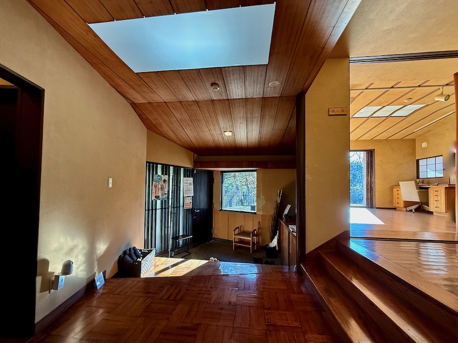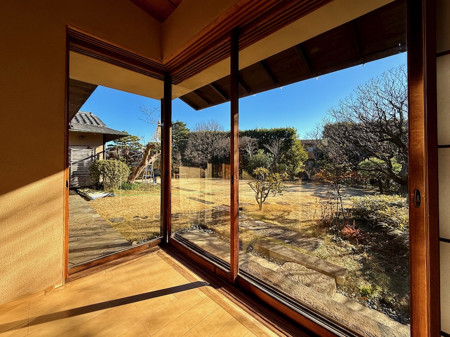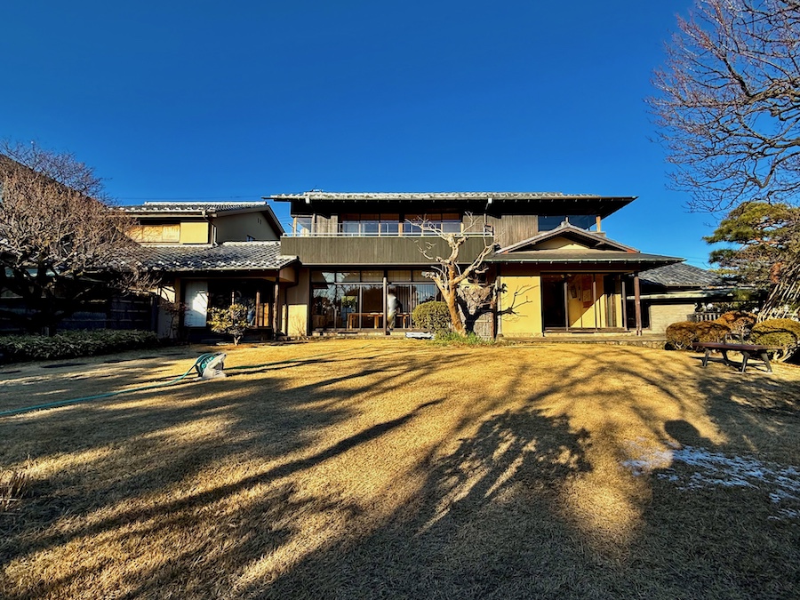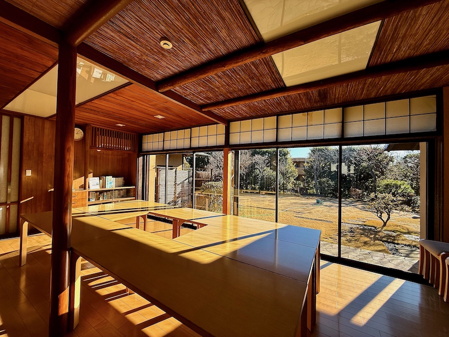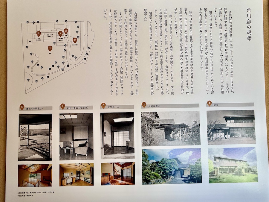 設計を手掛けたのは角川源義と俳句仲間だった建築家・加倉井昭夫、施工は東京の名工・水澤工務店。瓦葺きの車寄せや障子戸などが伝統的な和のエッセンスもある一方で、所々海外の山荘の様な洋のエッセンスも取り入れられた近代数寄屋建築――加倉井さんは近代数寄屋建築の巨匠・吉田五十八の後輩にあたる人物で、その作風や庭園・南向きのL字型のガラス戸は五十八さんからの影響を強く感じさせる!(※水澤工務店は吉田五十八の建築にも幾つも関わっています)