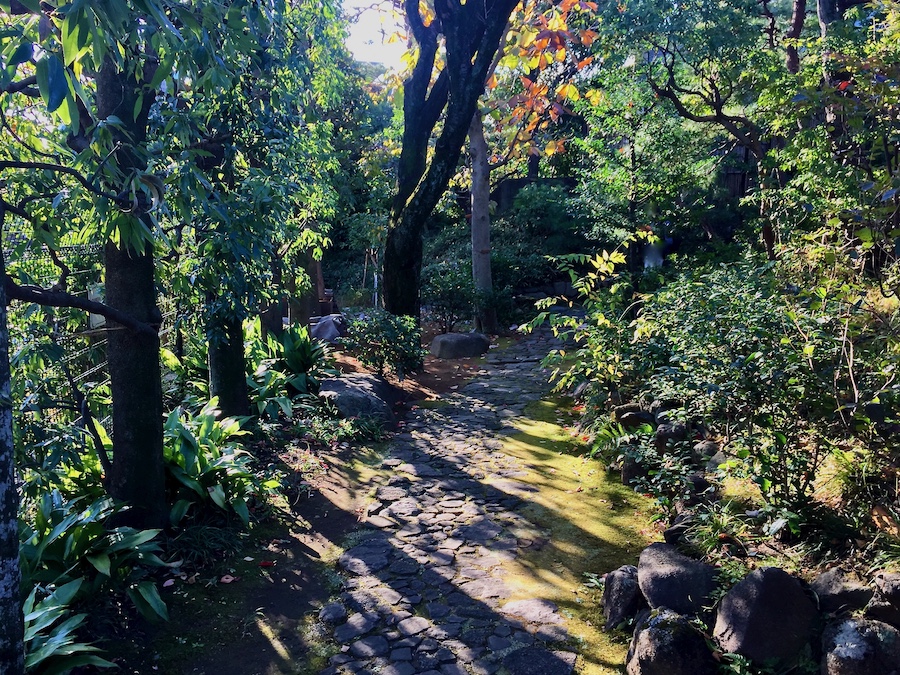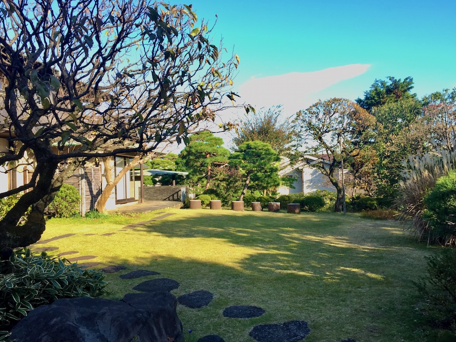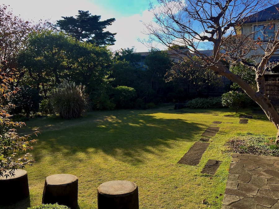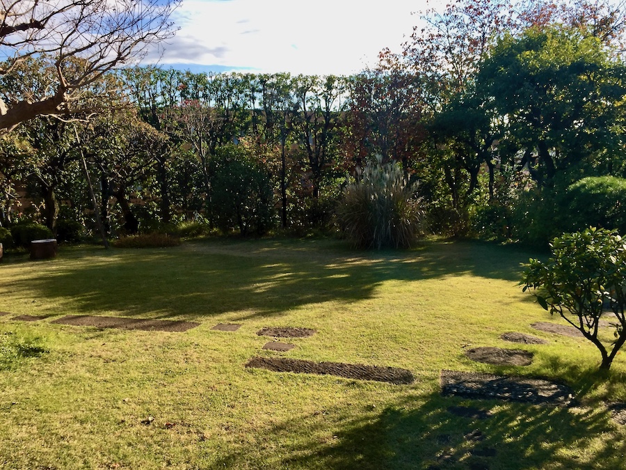 建物の南側に庭園が広がります。ちょうど斜面のある敷地に建てられた旧角川邸、庭園もその地形を活かしていて、玄関前から分岐する園路は斜面沿いにもうけられ自然を感じさせる空間…そして斜面上部に立つ邸宅の前には開放的な芝庭と茶室へと至る茶庭やつくばいが配されています。