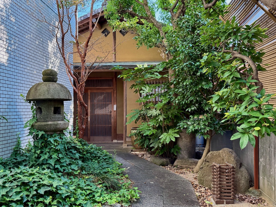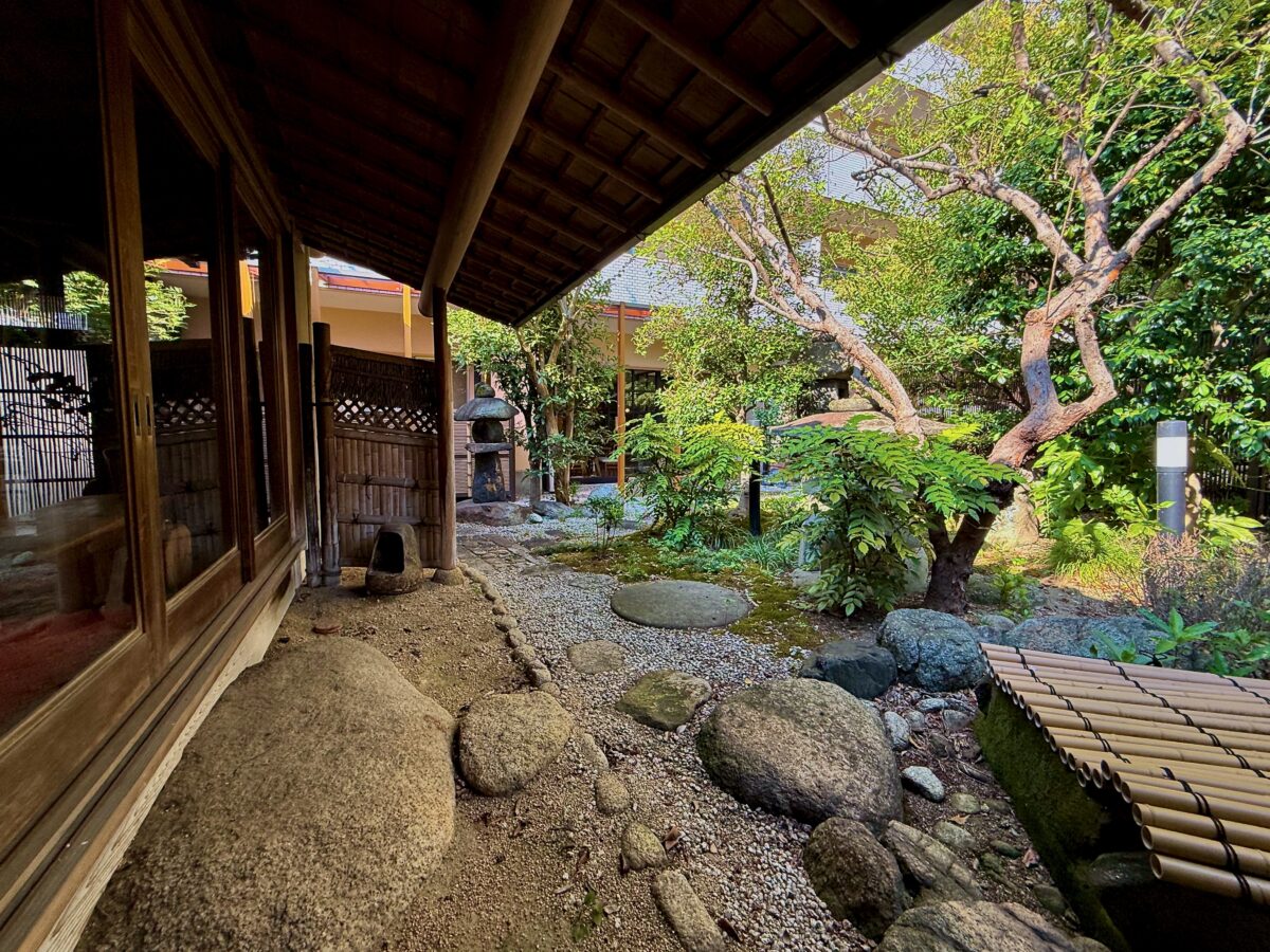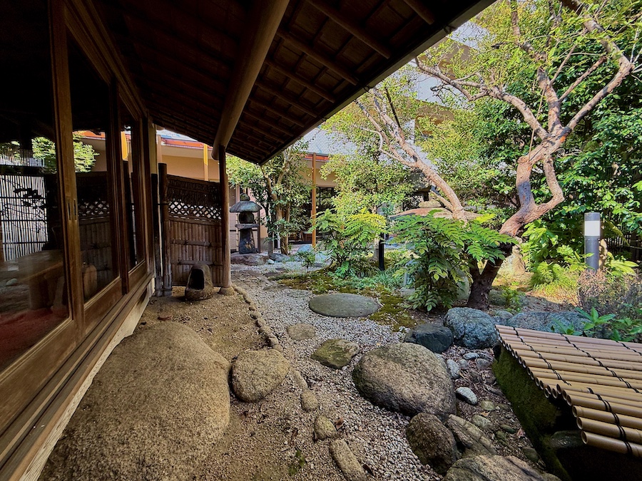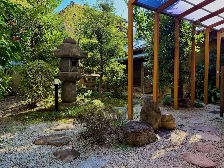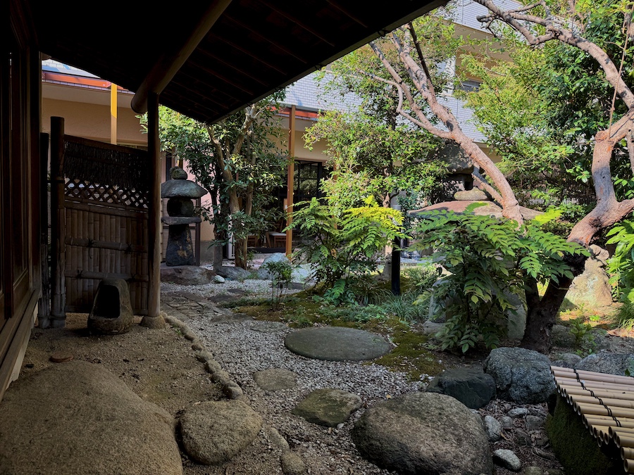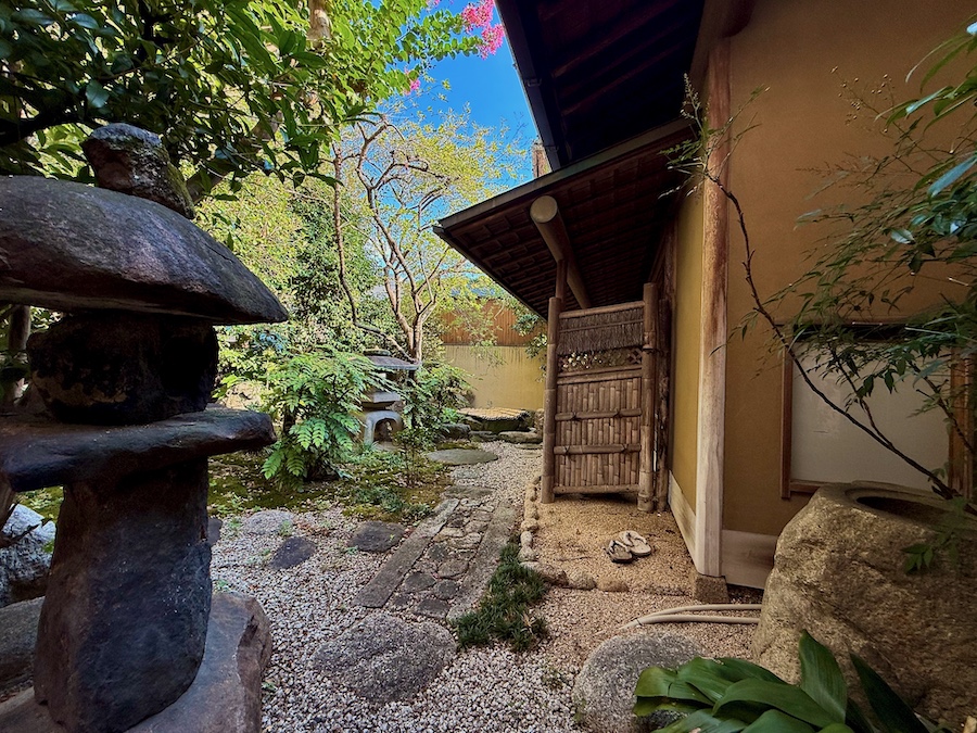 カフェの前に広がる庭園はかつてこの地に存在した料亭『菊本』の庭園の一部で、お茶室も元はその料亭にあったもの。それぞれいつ頃のものかは現段階では不明なのですが、お茶室前の灯籠や伽藍石の雰囲気、また「白壁」エリアに実業家が集った歴史…などから考えると近代〜昭和時代初期のものでしょうか。