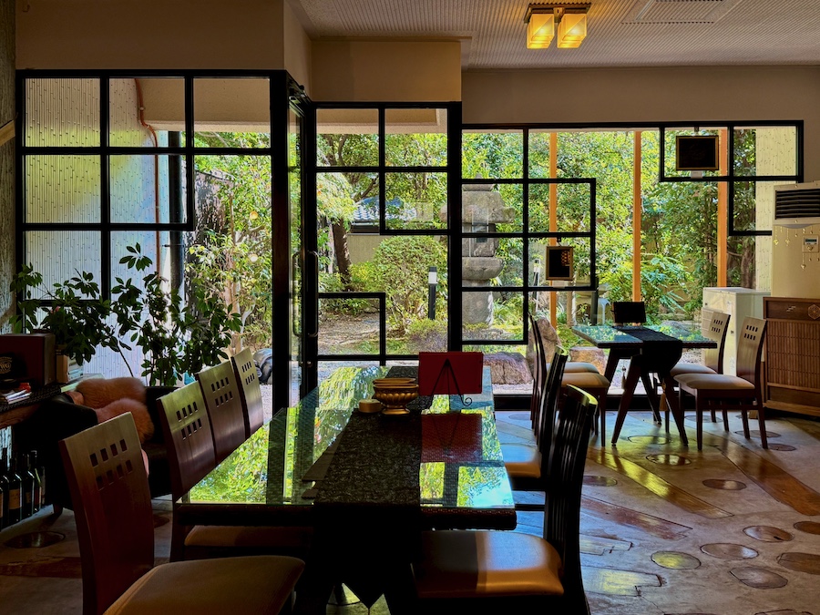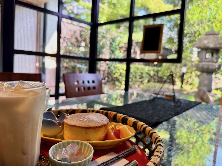 そのマンションの駐車場の片隅に暖簾のかかったその門があり、その先に茶室と日本庭園、そしてカフェがあります。店舗そのものはマンションの一階にある。けど表の駐車場からは見えない。あまり体感したことのない、変わった構造の…まさに「隠れ家」的なカフェ…。