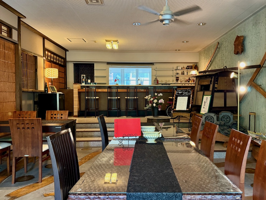 そんな“純和風”な庭園とはまた異なる、モダンとレトロが同居した店内…でも洋風な雰囲気の中にもかつての料亭の木材や鬼瓦、駕籠などが!