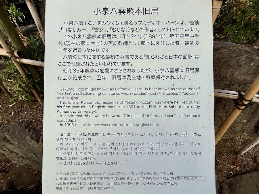 2025年NHK朝ドラ“ばけばけ”で注目の小泉八雲(ラフカディオ・ハーン)が松江の次に暮らした“熊本旧居”。大名茶人・松平不昧公ゆかりの石造物も。熊本市指定有形文化財。