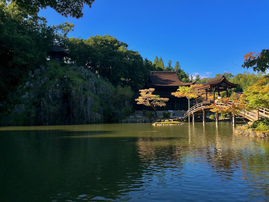 境内中央にある池泉「臥龍池」、その中央で岩壁の脇に位置するのが「観音堂」(水月場/観音閣)。鎌倉『円覚寺』の舎利殿と並ぶ鎌倉時代の代表的な唐様建築として国宝に指定されています。
