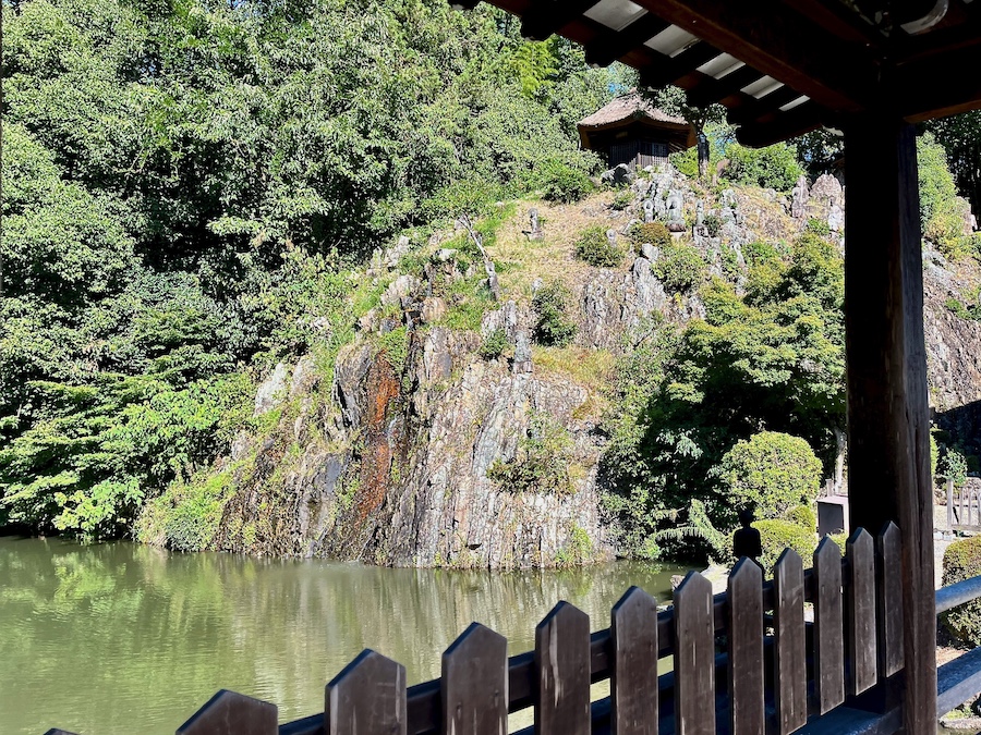 時には国宝・観音堂や橋をリフレクションする池の周辺からの景観も素晴らしいのですが、当時の夢窓疎石のビューポイント、座禅を組んだ“座禅石”は岩壁の上。座禅石のあった場所には門が閉じていて行くことは(現在は)できませんが、庭園を上部から見下ろすビューポイントもあります。