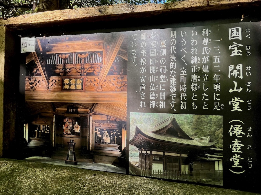 また同じく国宝に指定されている「開山堂」(僊壺堂)は観音堂からおよそ40年後の1352年、南北朝時代(室町時代初期)の建築。夢窓疎石が亡くなった翌年に将軍・足利尊氏により建立され、その内部では夢窓疎石と開山・元翁本元(仏徳禅師)の座像が祀られています。この先の非公開エリアに疎石は庵を結んでいたとか。