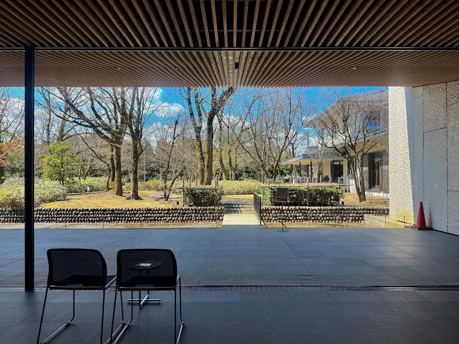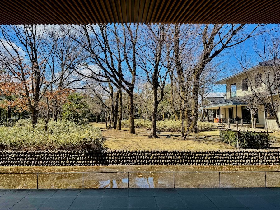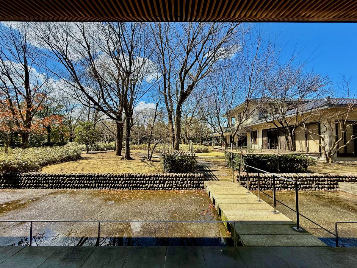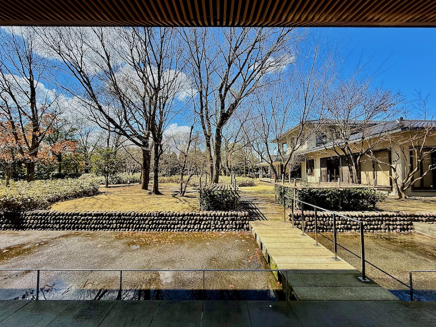 そんな主庭を「屋敷林」と見立て、文学館のランドスケープを手掛けたのが現在の造園家・宮城俊作率いるプレイスメディア。訪れたのが冬場で、先述の「土間」にもうけられた水路の水が抜かれている状態で伝えられないのですが…緑はえる季節には、こちらの水盤に屋敷林の緑がリフレクションする仕掛けになっています。