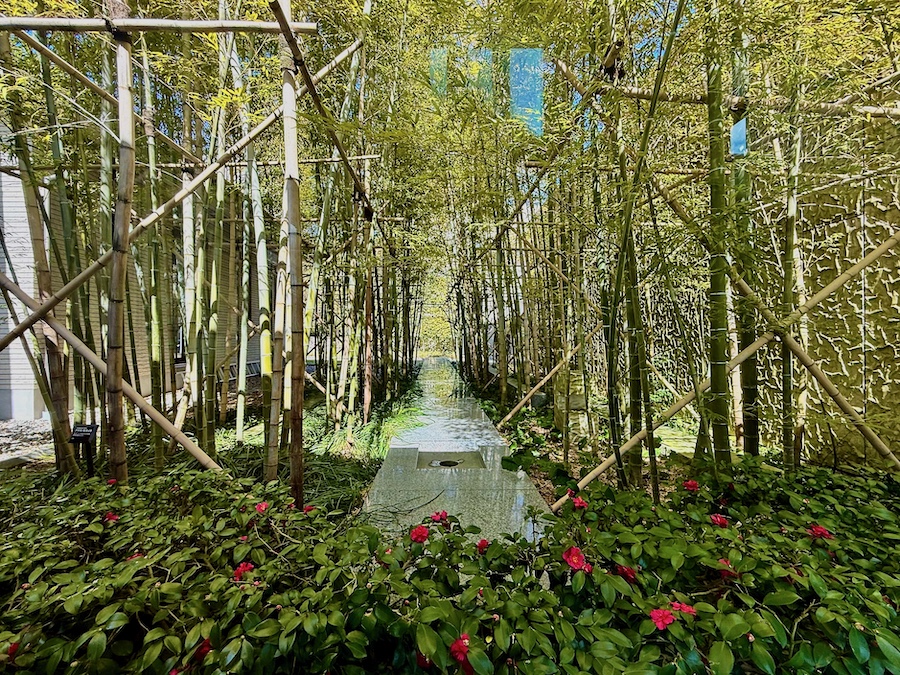 文学館の北側にもうけられた通路から眺められる、竹林とサザンカを主体として、中央に透明な床材を配した空間(「花の庭」?)もモダンな坪庭といった趣き!