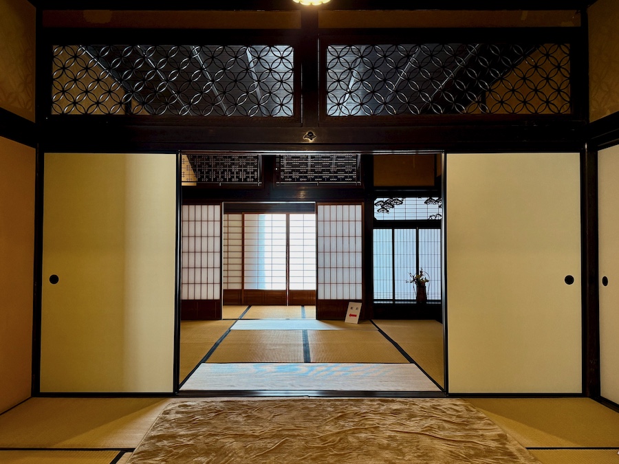 この中尾家住宅の主屋は江戸時代中期の建築(と推定されています)。当時の捕鯨の様子を描いた絵図『小川島鯨鯢合戦』にも描かれている、いわゆる大型町家なのですが、1階部分の面座敷〜中の間〜座敷の欄間や書院の意匠がめちゃくちゃオシャレで、この町家では藩の要人も迎えられていた…ということが想像できます。