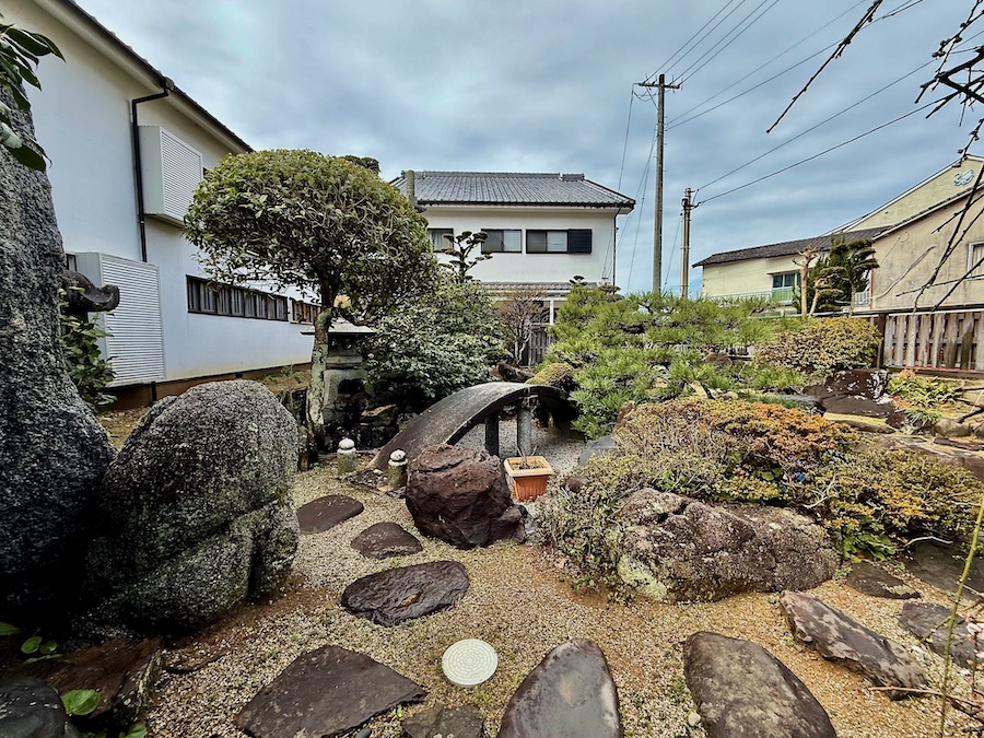 海の側という立地から?ツルッとした感じの庭石が多用されているのも印象的なのですが、その築山の脇の石積、大きな石橋、その築山から見下ろした時に見える、庭のサイズからすると異様に感じる立石。そして石鳥居を加工した手水鉢…などなど、当時の施主や庭師のセンスが節々から感じられるお庭!前述の“異様に感じる”ような立石は、唐津中心部の『旧大島邸』にも似たのがあったなぁ。