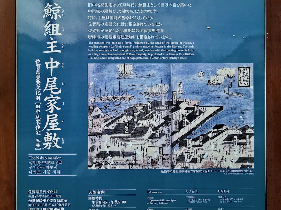 まず、あまり聞き慣れない「鯨組主」について。日本における“捕鯨”の歴史は古代まで遡りますが、江戸時代には現在の佐賀県・長崎県(唐津〜壱岐〜平戸)は捕鯨が盛んな地域だったそう。「鯨組」は主にその地域で組織された捕鯨事業の運営組織(捕獲から加工・処理までの工場としての役割も)で、中尾家は唐津藩において江戸時代から明治時代初期にかけて約170年間もの間「鯨組主」を務めた家柄(農業で言う大庄屋に近い?)。