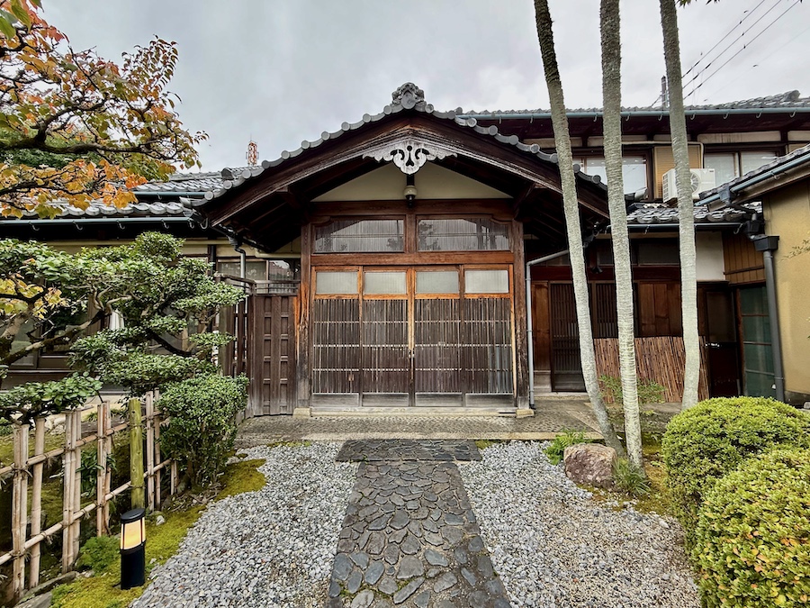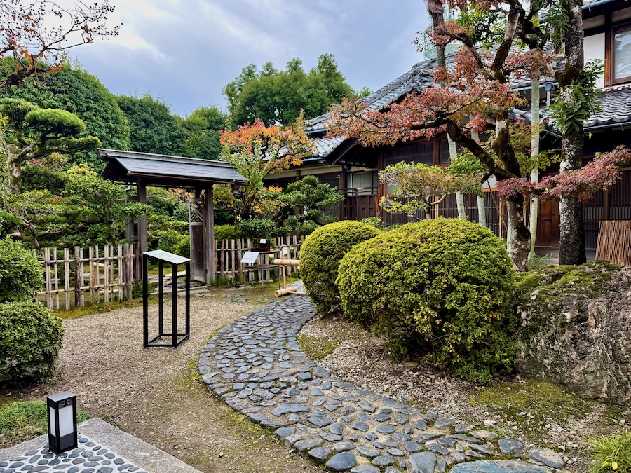 明治維新の神仏分離で妙覚院は廃寺となり、長浜八幡宮の神官の邸宅となった後に現在の様な企業の寮(迎賓館)となりました。玄関前の石畳(延段)は近代に京都で人気を集めた銘石・真黒石のような川石が敷き詰められていて、(『慶雲館』に七代目小川治兵衛が関わったように)近代京都の影響も感じる。