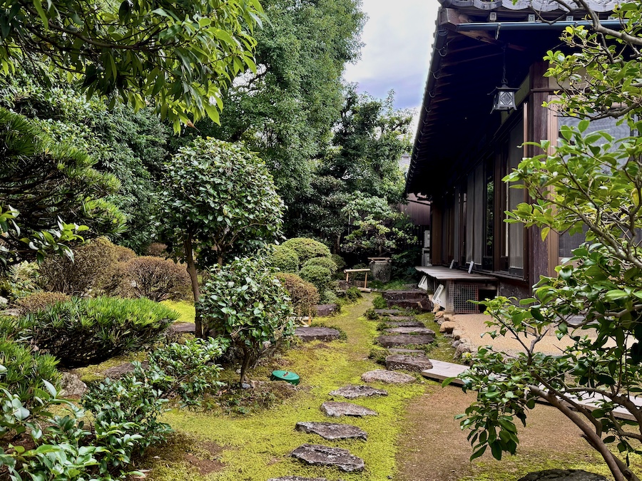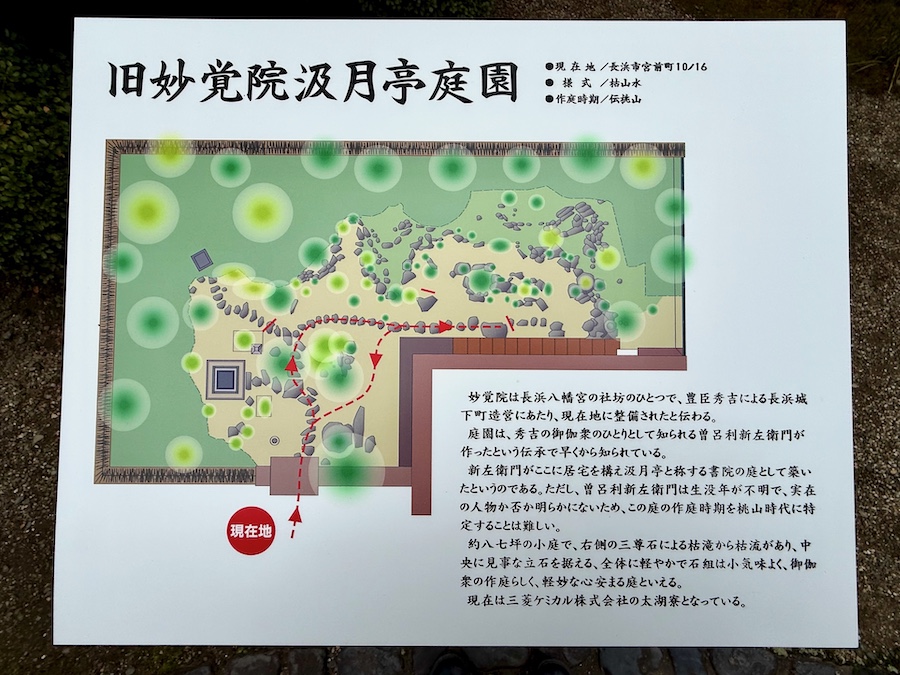 そんな長浜八幡宮の西参道〜石鳥居の手前にある「八幡宮社坊 妙覚院跡」の石碑。この石碑に沿って建つのが長浜にも事業所を構える三菱ケミカル株式会社の「太湖寮」。こちらに、長浜の旧市街で最古の庭園…と言われるお庭が残されています。通常非公開ですが、年一回程度特別公開あり(コロナ禍で休止していたそうですが、2024年より再開されたとのこと)。 滋賀の庭園関連の書籍(『滋賀の美・庭』など)でも登場していた、ずっと見たかった庭園…2025年の特別公開で初めて訪れました。