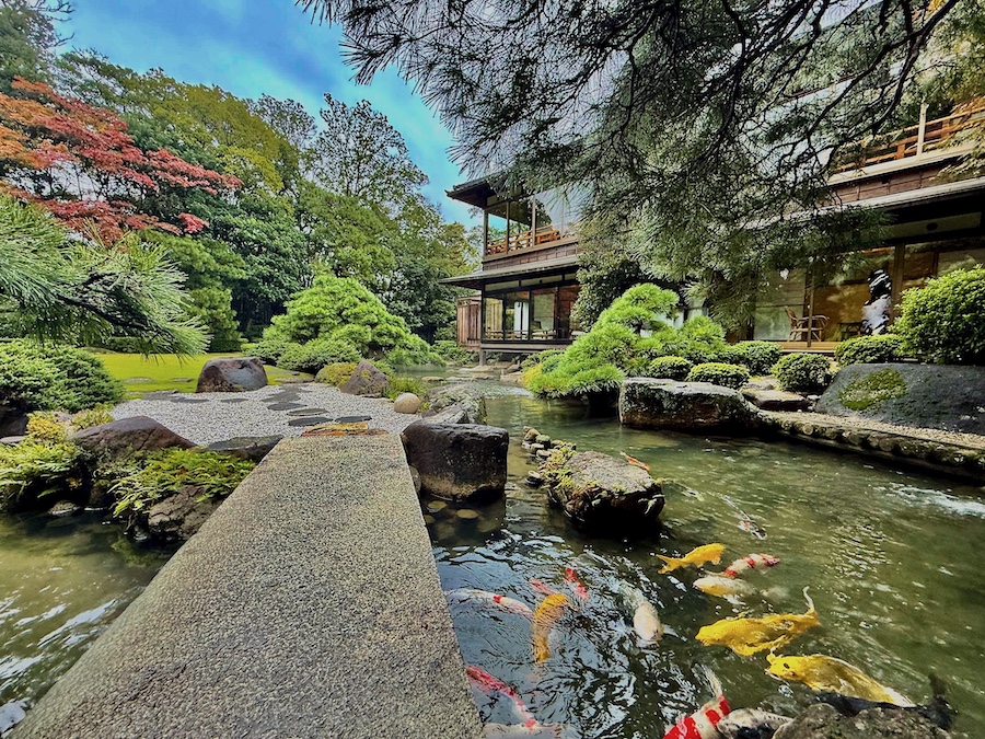 それらの和風建築に面して庭園が広がります。敷地の奥に大きな滝があり、そこからの水の流れがダイナミックに建物前を横切っていく庭園——。作庭(改修)を手がけたのは近代の京都を代表する庭師・七代目小川治兵衛(植治)のチーム。先述の“快活楼”の建設時(1918年(大正7年)頃)、山縣有朋が京都『無鄰菴』での繋がりから小川治兵衛をこの地に呼び寄せたそう。なお改修以前には江戸時代中期に作庭された“素朴な枯山水庭園”があったそうですが、植治によってまさに無鄰菴のような“流れ”や西洋式の芝生を取り入れた“流水回遊式庭園”へと生まれ変わりました。