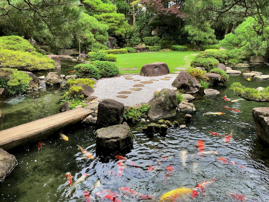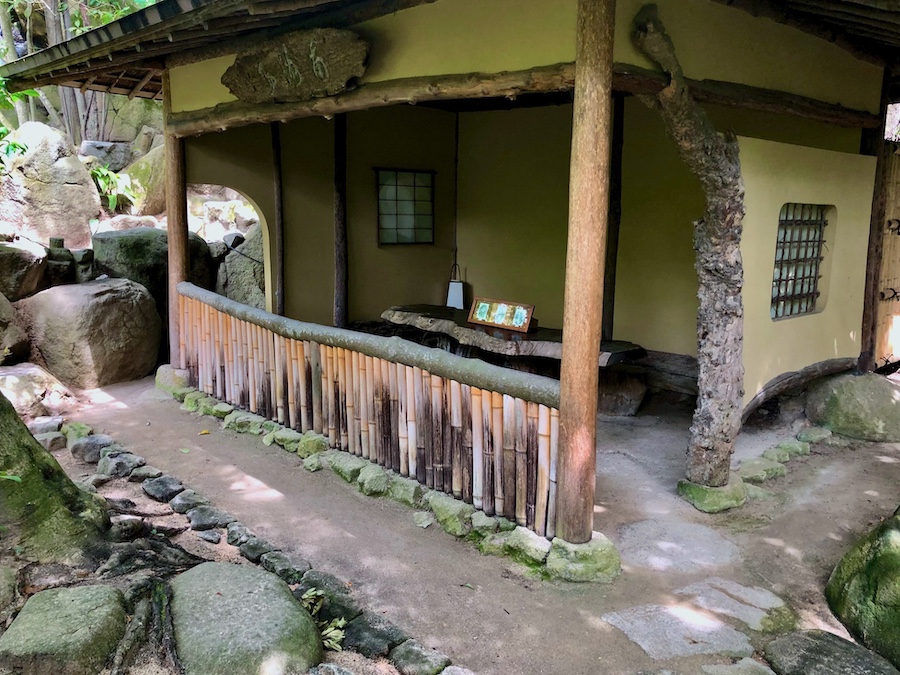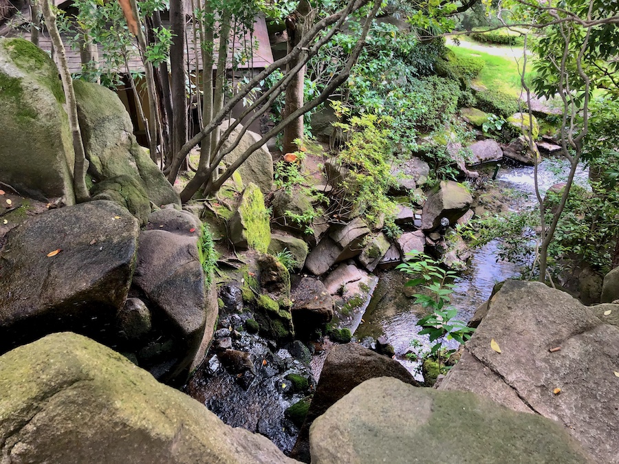 そして、個人的に気になるのは足湯「桂亭」の脇の小滝にかかる、たくさんの小石による石橋(23枚目)。同じスタイルの石橋が同じく山口市内の近代日本庭園『山水園』にもある、けど他の植治のお庭ではあまり見た記憶がない。山水園の作庭は植治ではない他の「京都の庭師」さんの名前が伝わっているけれど——どこかのポイントで同じ庭師が関わったりしていたのかなあ?