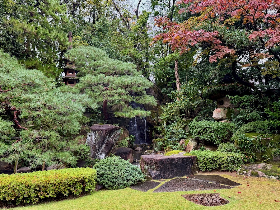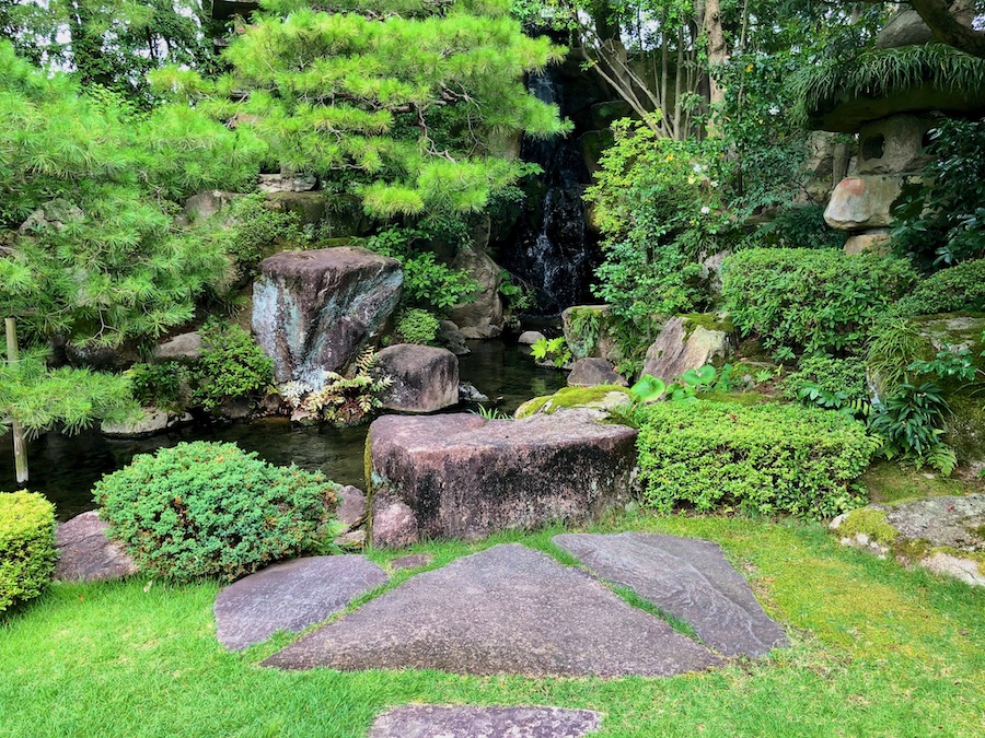 七代目小川治兵衛の作庭——というだけでなく、山縣有朋が呼び寄せたという背景も考慮すると。無鄰菴の様に指示はしていないにせよ、“有朋の好み”はきっと意識されていて——無鄰菴を造営した約20年後に、植治がその成長を見せつけた庭園——なんて風にも思う。一方で異なる点も勿論あって、池泉に迫り出した和風建築の感じは植治の最初期の作品『並河靖之七宝記念館』のお庭を思い起こすし、無鄰菴より深い池に置かれた(スリリングな)沢飛び石。そして豪快な“大滝”から「アップデート」を感じさせます。また大滝は快活楼から正面ではなく、西郷・木戸・大久保会見所『南洲亭』の脇にある位置関係も気になるポイント!