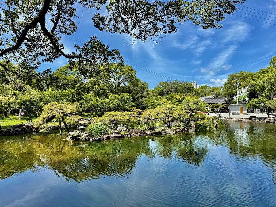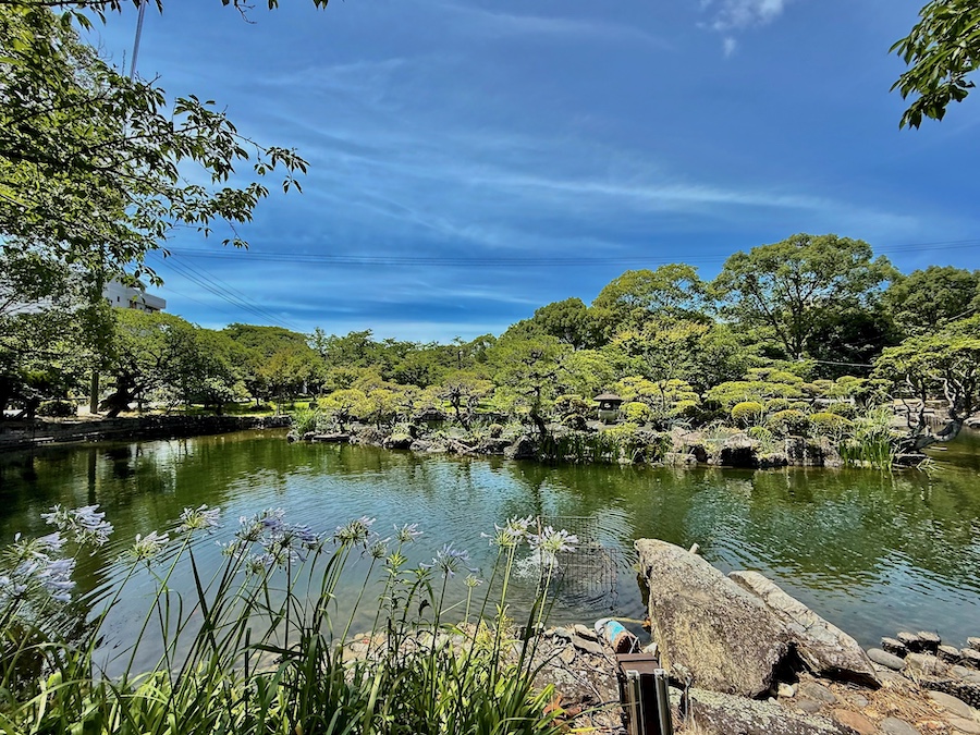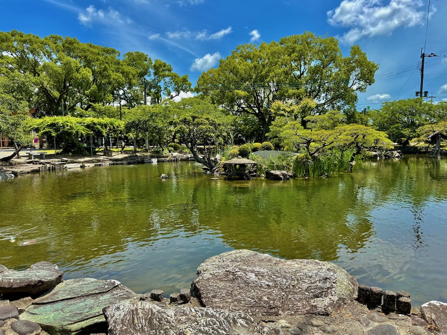 まずは本殿の南東部に位置する「心字の池」。掘割から取り入れた水による広い池泉回遊式庭園で、中島にはマツが何本も植わり雰囲気もどこか大名庭園チック。遅くとも明治時代の古絵図には描かれていますが、おそらく江戸時代後期の創建時の作庭…かな?池泉の東側(参道沿い)には北原白秋ゆかりの手水舎も。