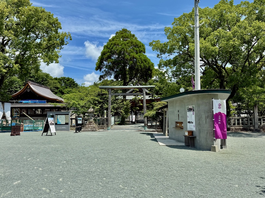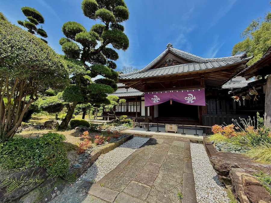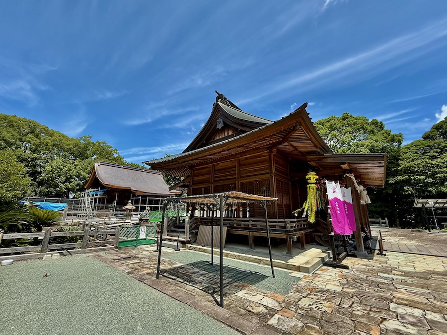 本殿の南側にある社務所。2016年の熊本地震では大きな被害を受けましたが、その後修復され現在は新しくも歴史を感じるきれいな姿を見せています。普段は中は見られませんが、玄関前庭の雰囲気も◎。