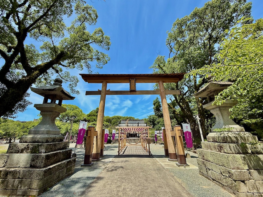 「三柱神社」(みはしらじんじゃ)は福岡県柳川市の玄関口・西鉄柳川駅から程近くに位置する神社。初代柳川藩主・立花宗茂と正室・ぎん千代、岳父で武将・戸次道雪を祭神としてまつり、その境内が“ランドスケープの国の重要文化財”こと国指定名勝の『水郷柳河』に含まれており、境内には日本庭園「心字の池」があります。