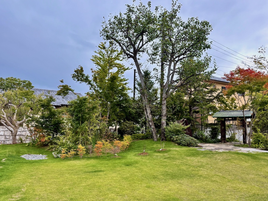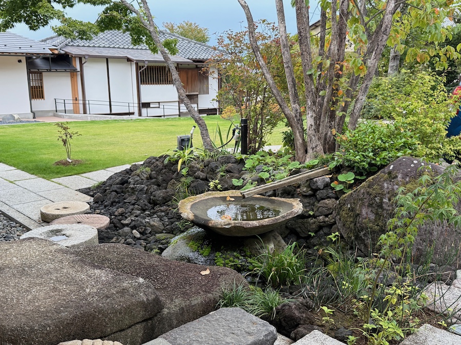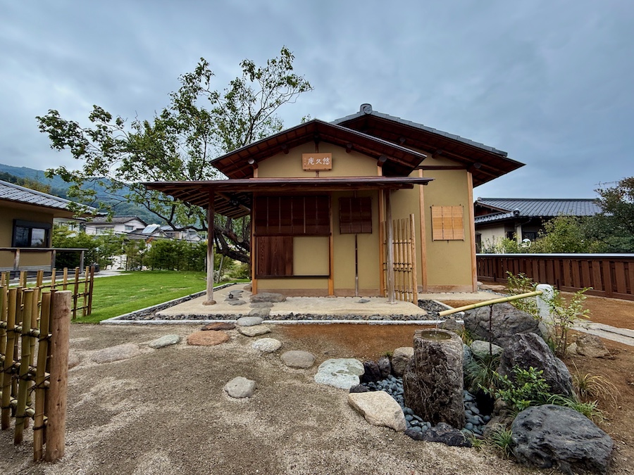 大村博士の生家『螢雪寮』とその庭園『創新苑』。それらと隣り合う場所に2025年に開かれたのがこの茶室・庭園で、『創新苑』の“下の庭”でもあります。“上の庭”と同じく、「日本庭園協会賞」受賞歴のある地元・山梨の造園家、田中徳夫さん率いる田中造園作庭。また、露地・茶庭には東京の金綱重治(金綱造園事務所)さんも協力。