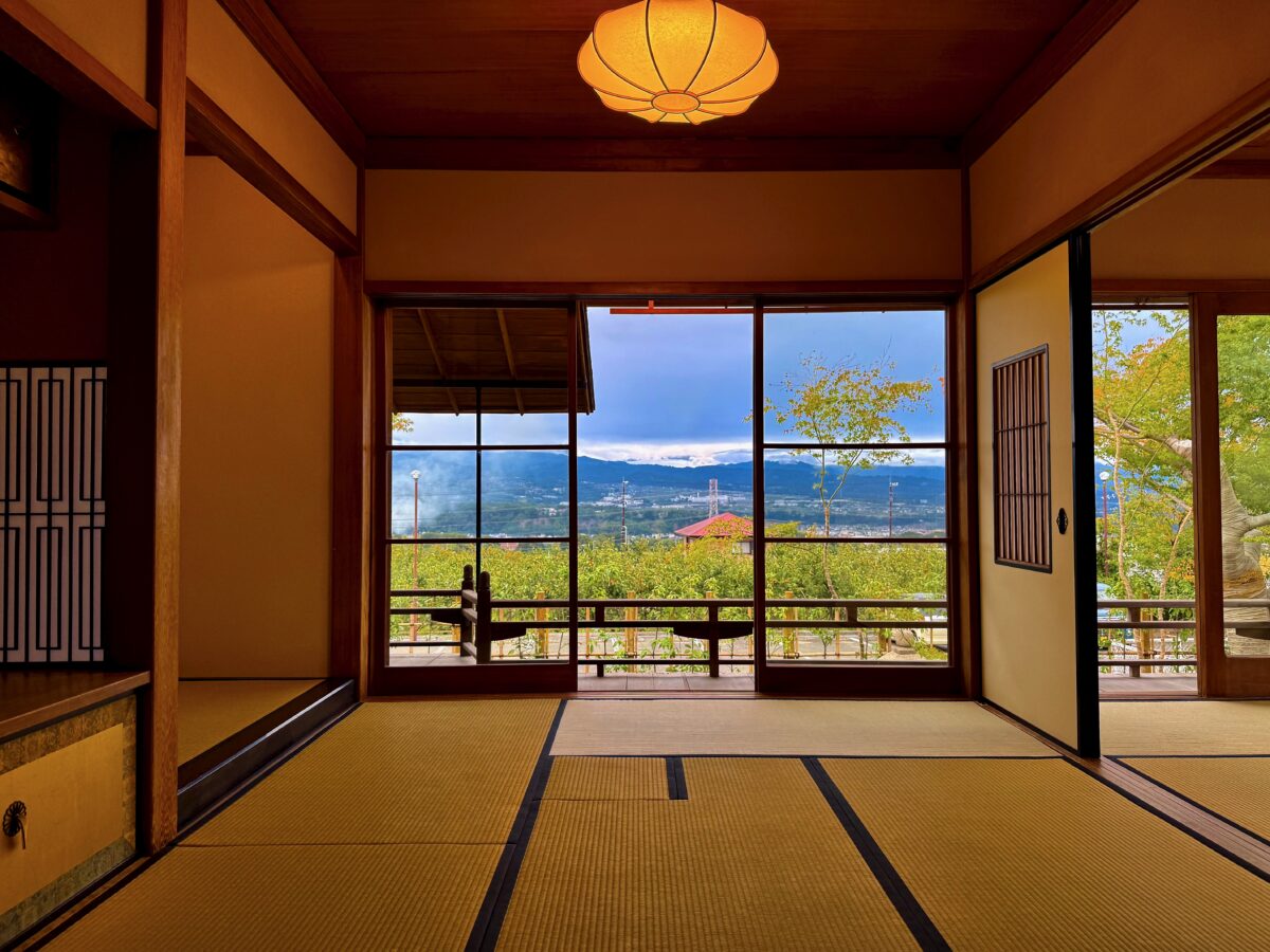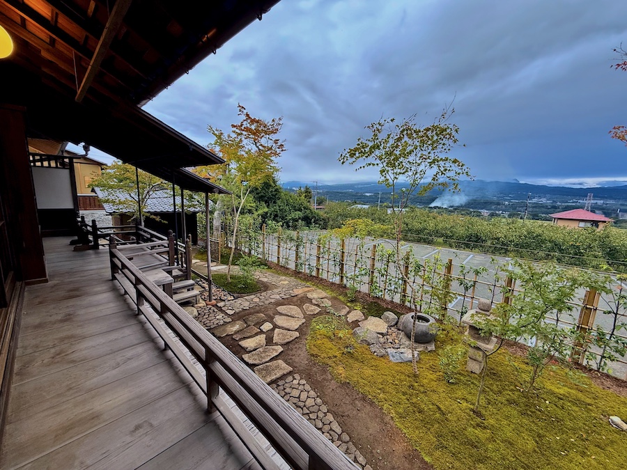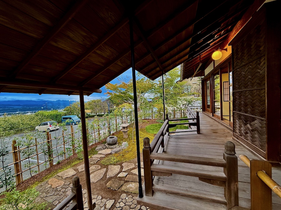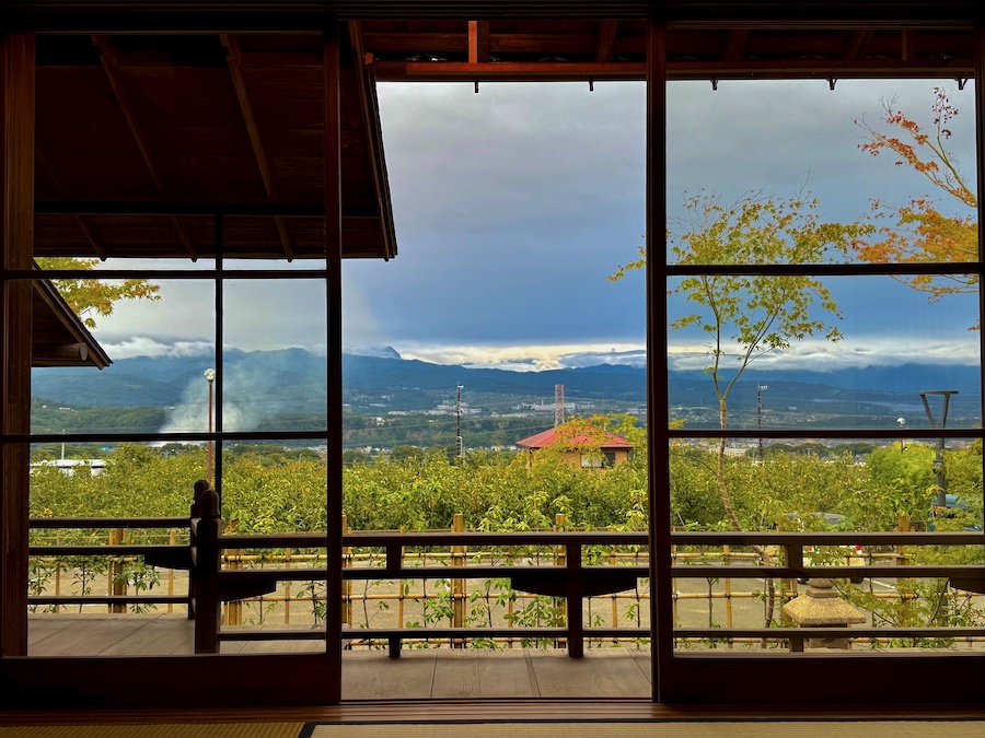 その広間(※お茶室利用時のみ入室可。庭園のみの観覧では見学不可)からの眺望が特に素晴らしい!元から眺望が意識された作りですが、この場では近年国の登録記念物となった『七里岩』と土木遺産『徳島堰』、そして山梨百名山の茅ヶ岳といった最高のランドスケープ。また、腰掛待合から階段を上がって茶席へと至る…といった構造もとても特徴的。