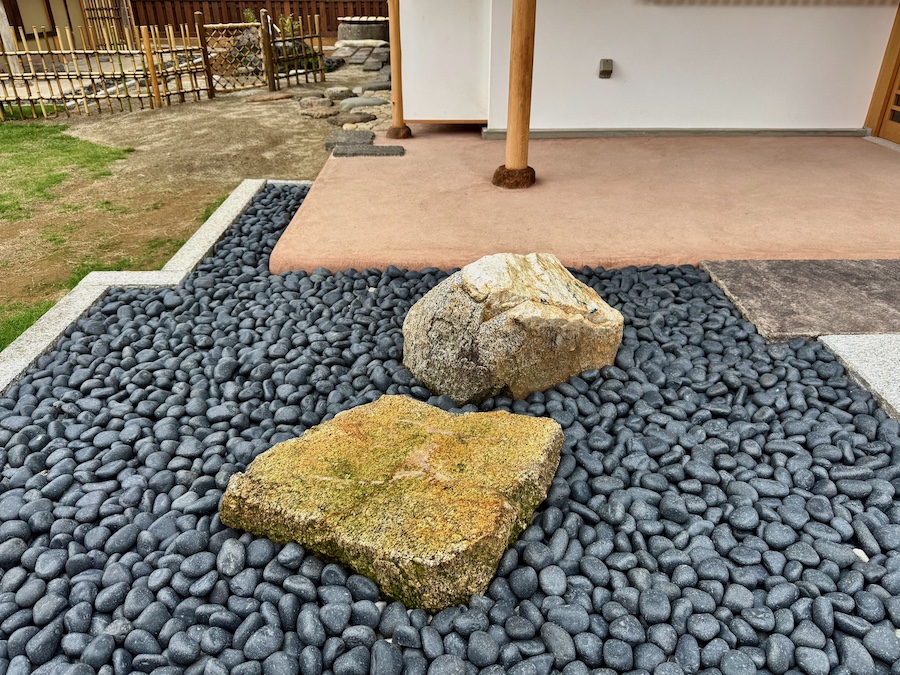 こちらにも露地がありますが(※植栽はこれから)、その腰掛待合の左手側にある四角い石、こちらはなんと国宝『薬師寺東塔』を1,300年間支えた礎石。大村博士が薬師寺で講演したお礼で受け取った貴重な石造物がこのお庭の見所の一つとして活かされることになりました。