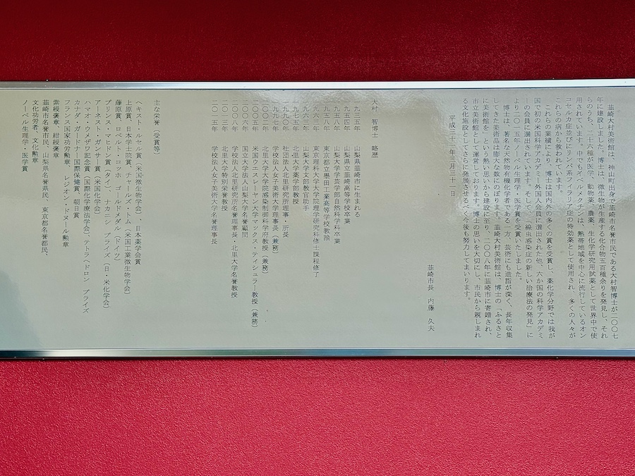 2015年のノーベル生理学・医学賞を始め多くの国際的な賞を受賞、“微生物化学の第一人者”“日本の産学連携の先駆者”とも称される大村智博士。コロナ禍に話題になった「イベルメクチン」の発見~研究開発に携わった方でもあります。韮崎市名誉市民、山梨県名誉県民の第一号にも選ばれました。