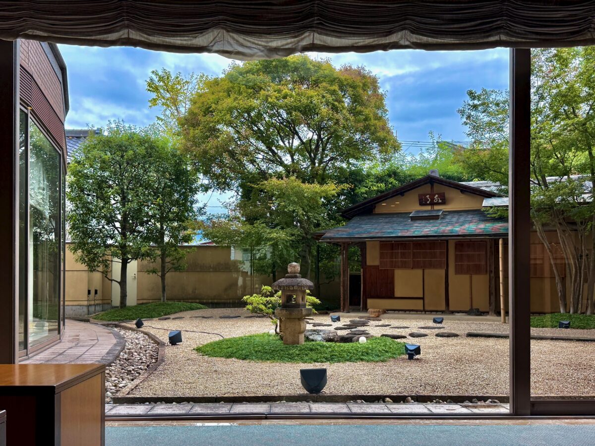 幕末・明治時代の豪商の屋敷から眺める枯山水庭園と、丸石の屋根が特徴的な国指定重要文化財建築。