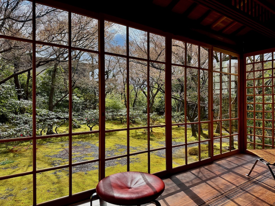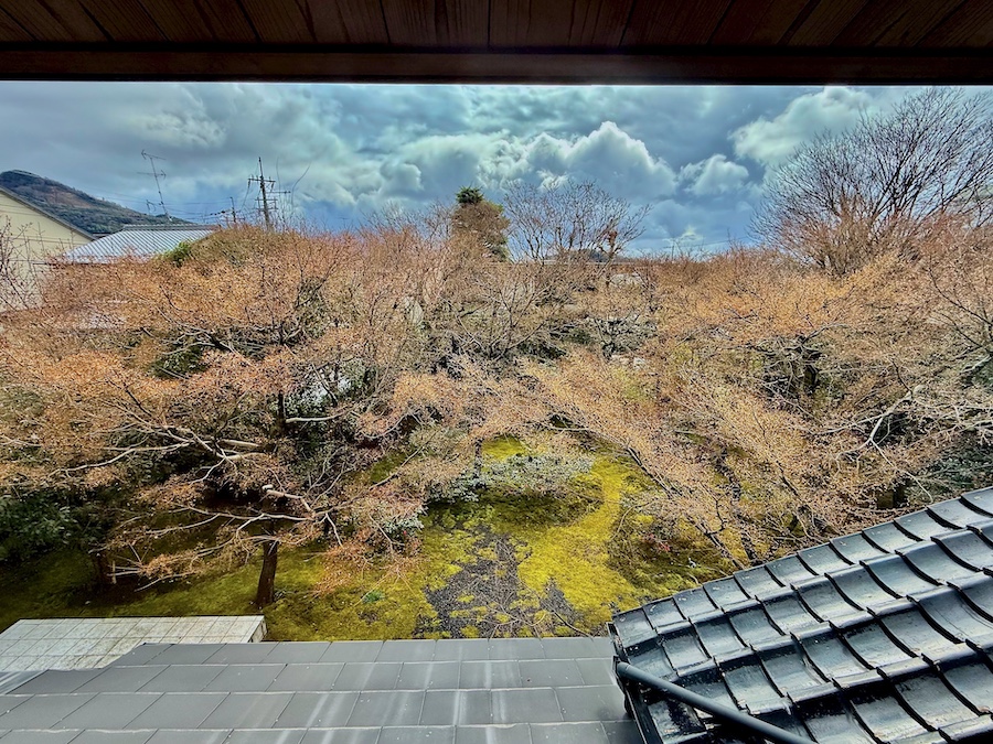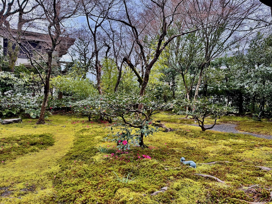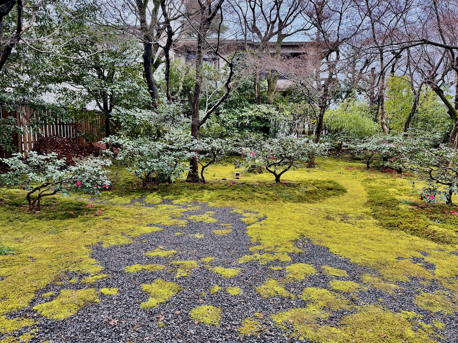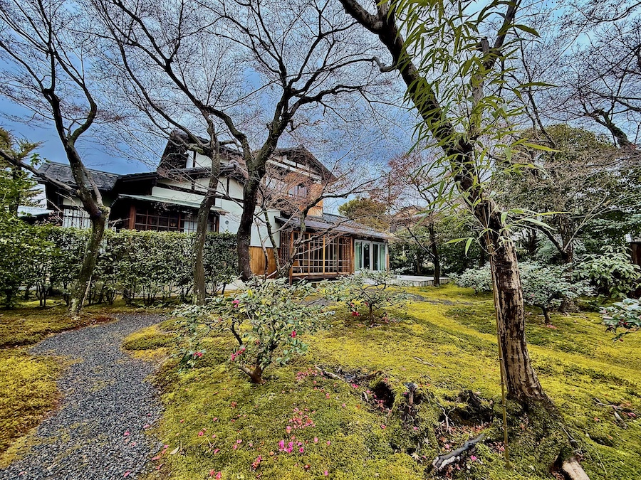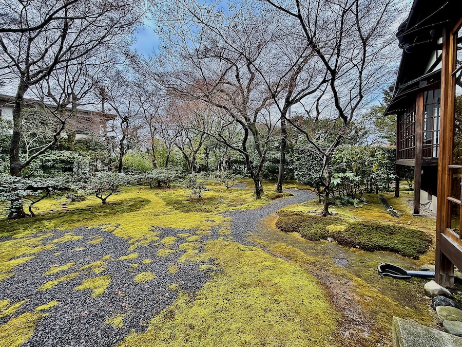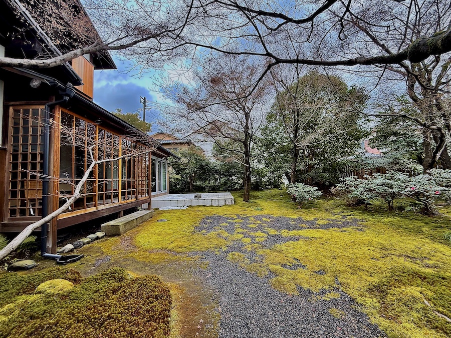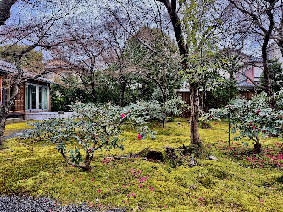 苔は後年(近年)広がってきたそう。近年の京都は特に暑く苔の維持管理が難しくなっている中で、元気にきれいに広がる苔…日々のお手入れの賜物はもちろんですが、すぐ傍を水路が流れる環境も苔庭にとってはプラスに作用しているそう。今回の写真は冬の姿ですが、苔にサザンカのピンク色の花びらが落ちた姿が◎。建築の後はお庭からの景色も眺めてみて。