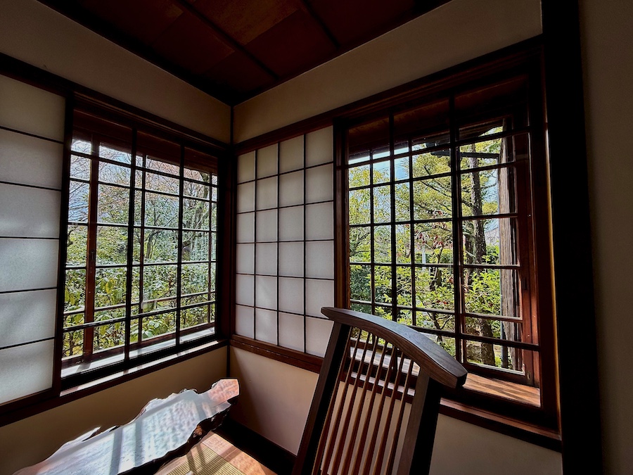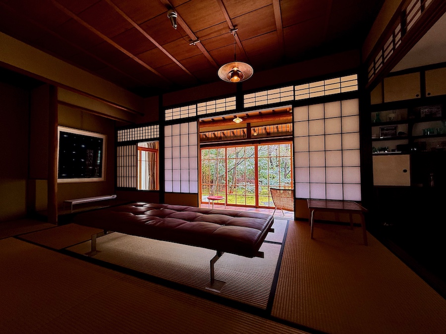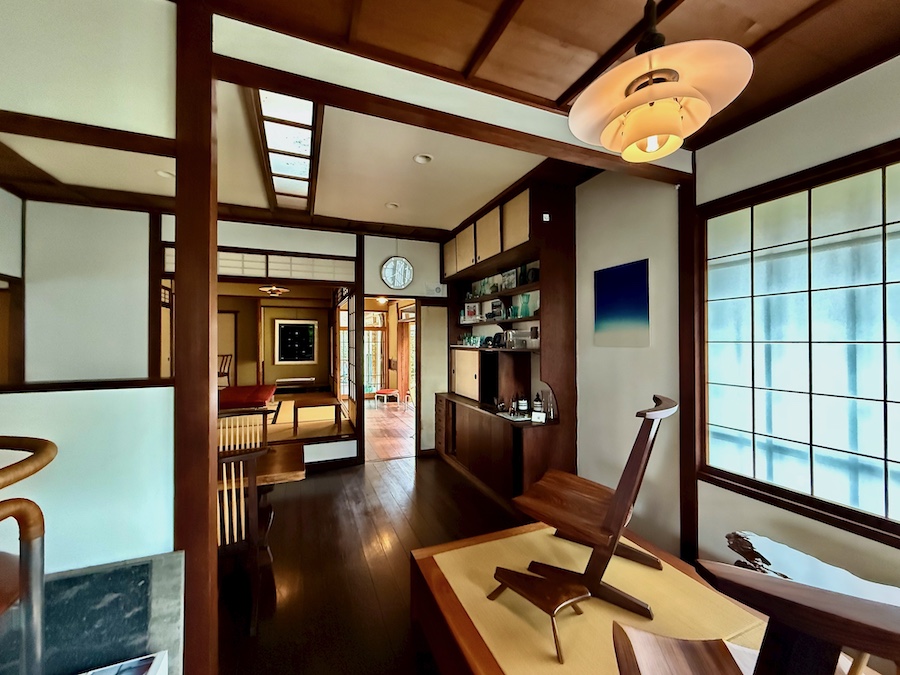 障子や床間、畳などの和の要素と、フローリング、ガラス戸など洋の要素が共存する、和洋折衷なデザインは『聴竹居』などと同様。1階中央部に畳のお座敷がありますが、温度対策のため?(+腰掛けられる実用性のため)一段高くなっている独特なデザイン。そんな空間を活かし、本ギャラリー所蔵の北欧のインテリアが配された素敵な空間。