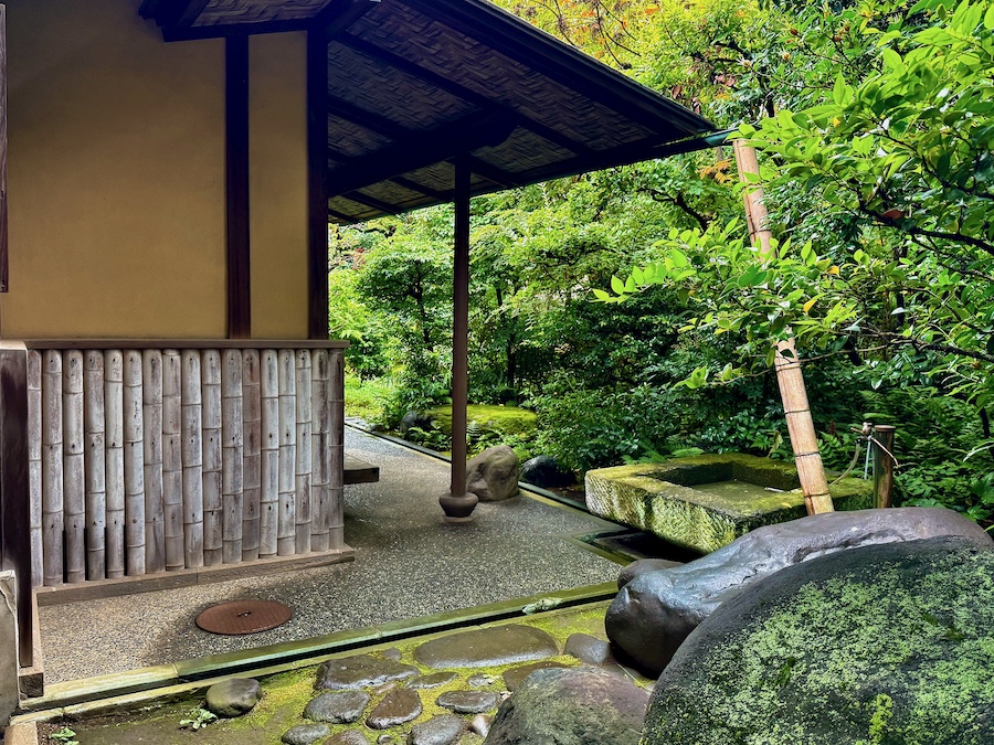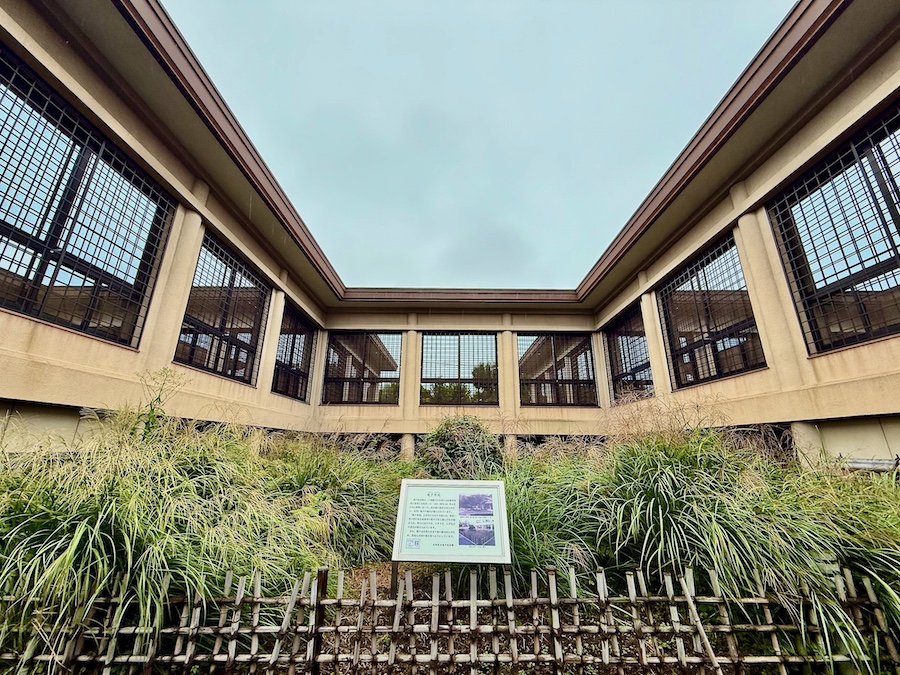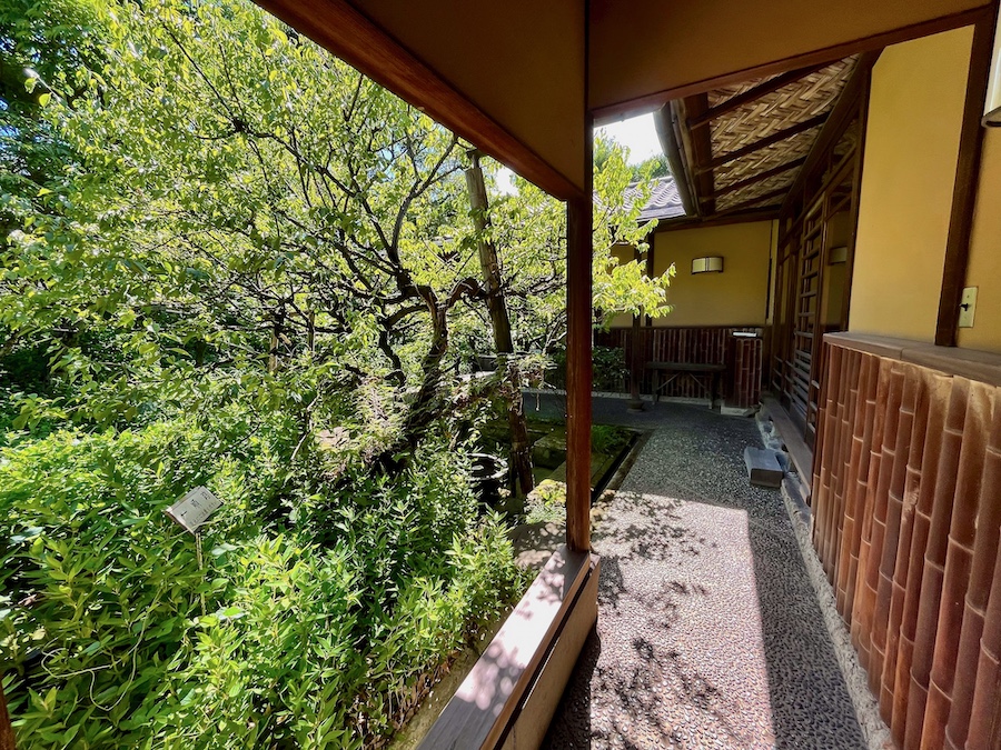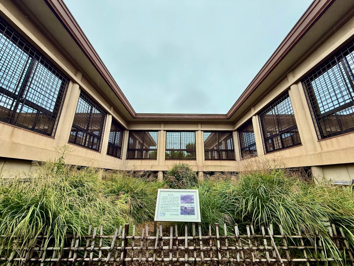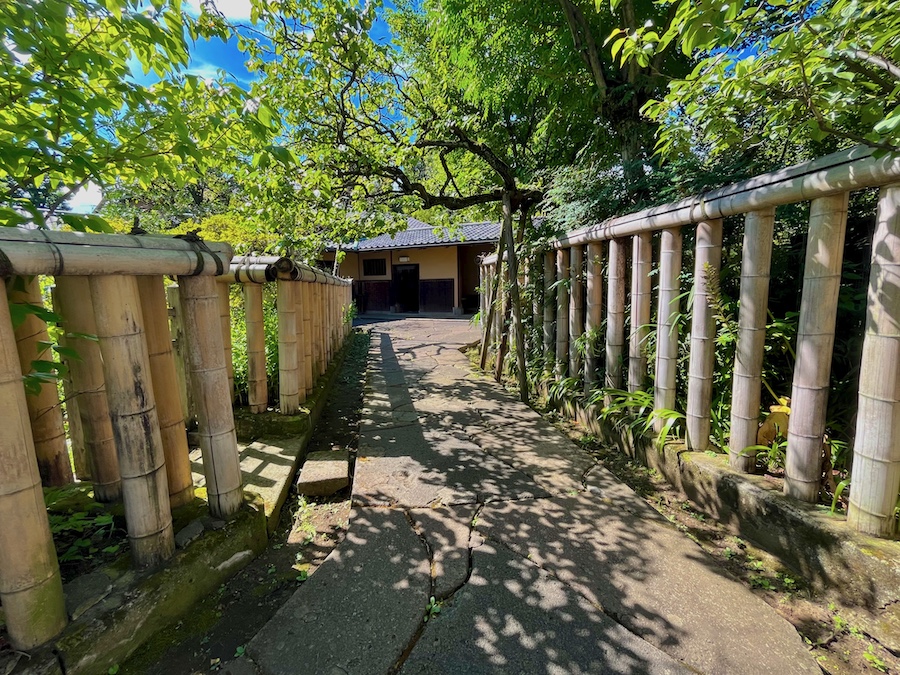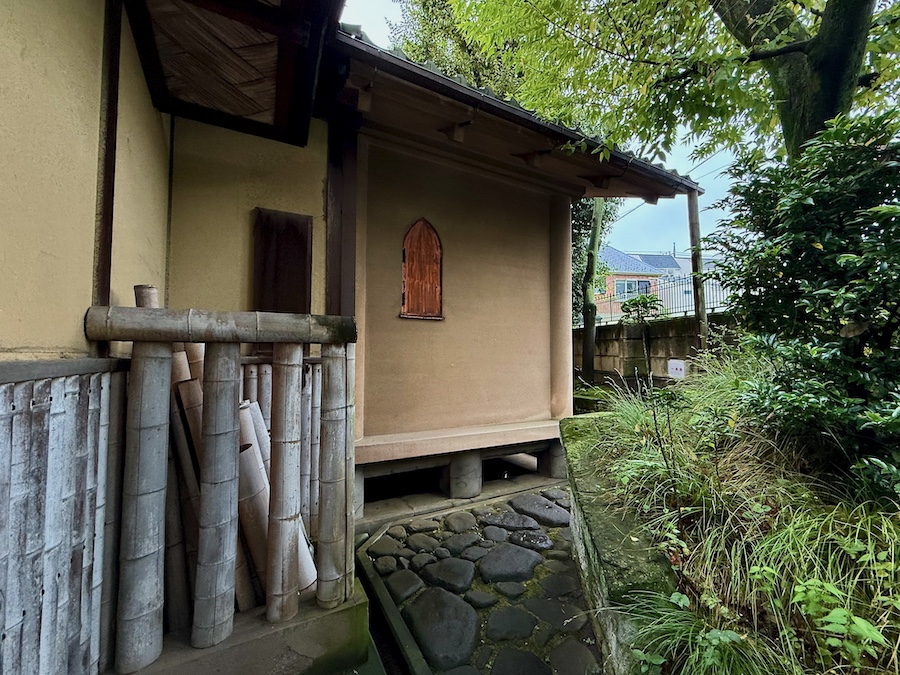 主屋やアトリエの軒、室内の天井ではこれでもか!というぐらい網代編み。玄関の戸も網代編みにも似た「卍」のようなデザインで、龍子のお気に入りの文様だった。室内に上がることはできず外から見るのみですが、うーん最高の近代数寄屋建築…!京都の数寄屋建築の名作『四君子苑』を昭和にアップデートしたかのような感じ。