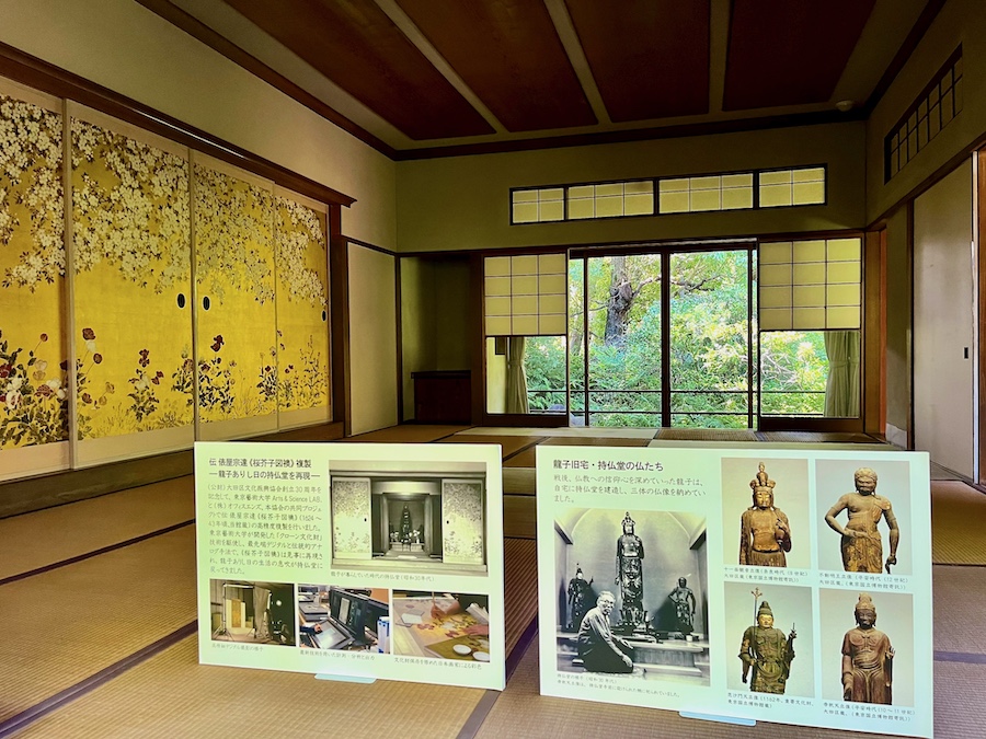 主屋の一角の持仏堂の中に展示されているのが国宝『風神雷神図屏風』の作者・俵屋宗達が描いたと伝わる『桜芥子図襖』(現在展示されているのは複製)。その襖の先には龍子の持仏が安置されていました。このうちの一つが国指定重要文化財の平安時代の仏像「毘沙門天立像」。現在は『東京国立博物館』に所蔵されています。