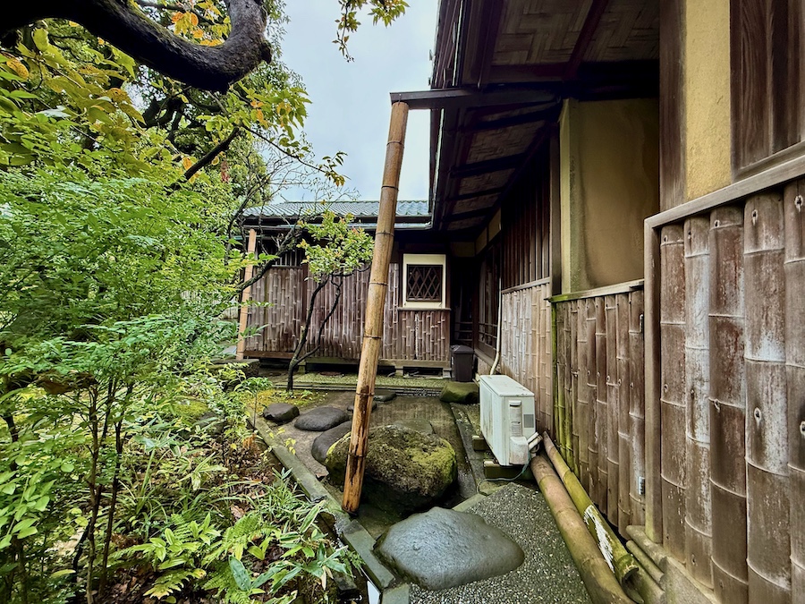 まずアプローチ…太い幹の竹を揃えた竹垣+直線的に屈曲した石畳が独特かつ前衛的な“和”のデザイン。そして長屋門風の待合と旧宅が迎えてくれる。