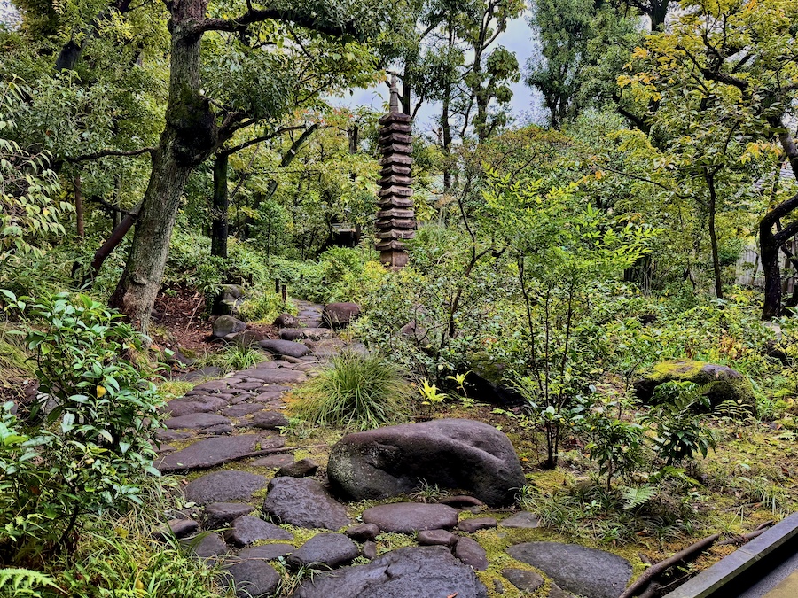 主屋(持仏堂)〜画室の間に広がる庭園は、アプローチとは異なる不均等な飛び石を歩きながら、小川のある自然の風景を感じる庭園。龍子が泊まり込みで作品制作に励んだ伊豆・修善寺の風景を表現したものとも言われます。(なお、龍子記念館の中庭もその修善寺の桂川の植栽などを取り入れたもの)
