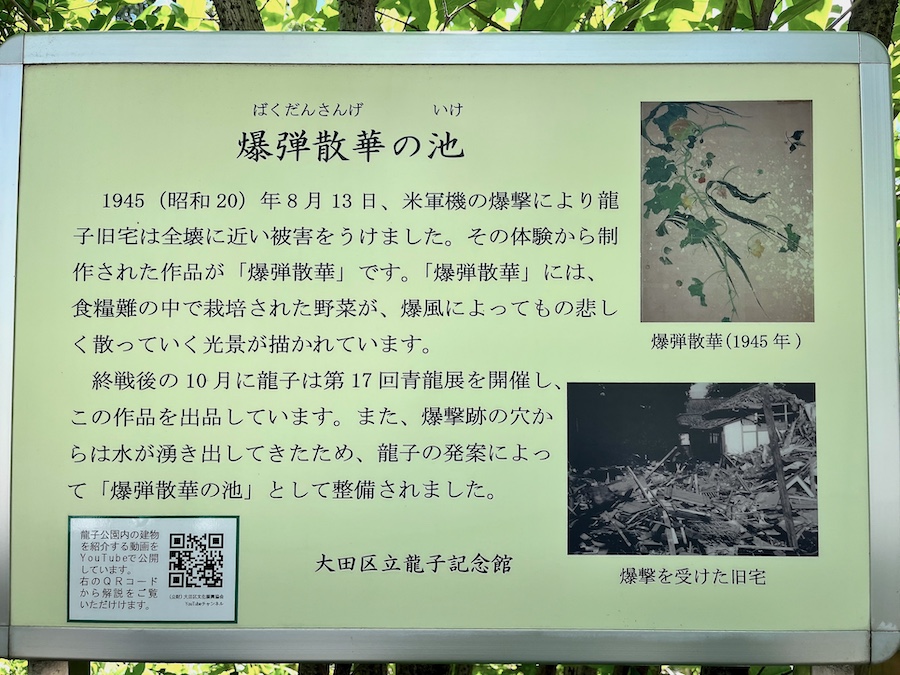 そんな旧宅と画室を繋ぎ・囲んでいる庭園。まず主屋の前/アプローチの脇にあるのが“爆弾散華の池”。空襲で失われた旧・主屋の跡の湧水を活かし造成されたこの池は、爆撃の爆風で飛び散る庭園の草花/野菜を描いた作品『爆弾散華』にちなんで命名されました。