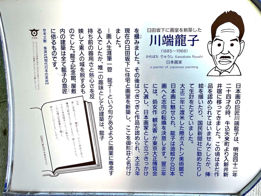 旧宅が残る馬込の臼田坂下に転居しアトリエを構えたのは1920年(大正9年)。この地で長い時間を過ごし、晩年に文化勲章受章と喜寿を記念して1963年(昭和38年)に設立されたのが『龍子記念館』。当初は川端龍子が設立した社団法人青龍社の運営でしたが、後に記念館・旧宅・作品が大田区に寄贈され、1991年(平成3年)から大田区立龍子記念館になりました。