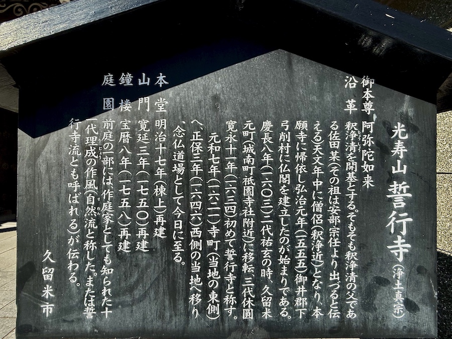 「光寿山 誓行寺」(せいぎょうじ)は福岡県久留米市の古い町並み「寺町」にある浄土真宗の寺院。その前庭の一部は、九州の紅葉の名所として有名な国指定文化財庭園『九年庵』の作庭者として知られる“久留米が生んだ名作庭家”阿理成(ほとりりじょう)の作庭。