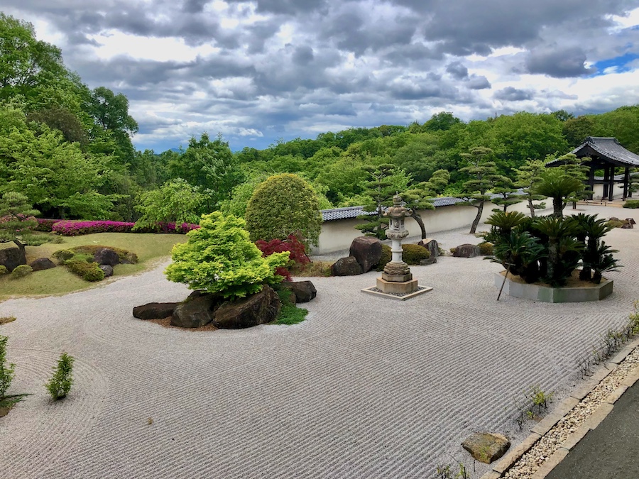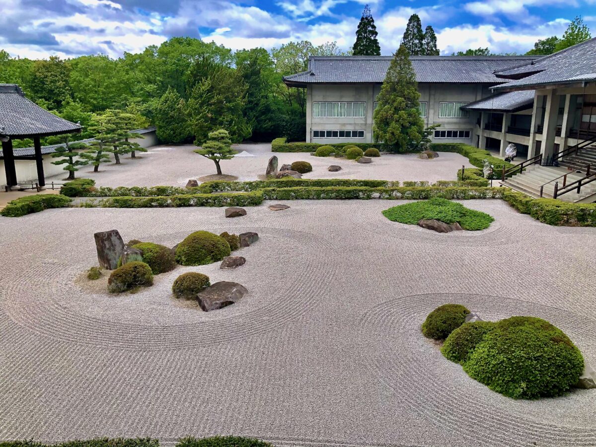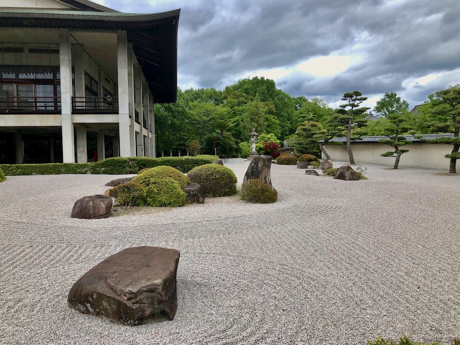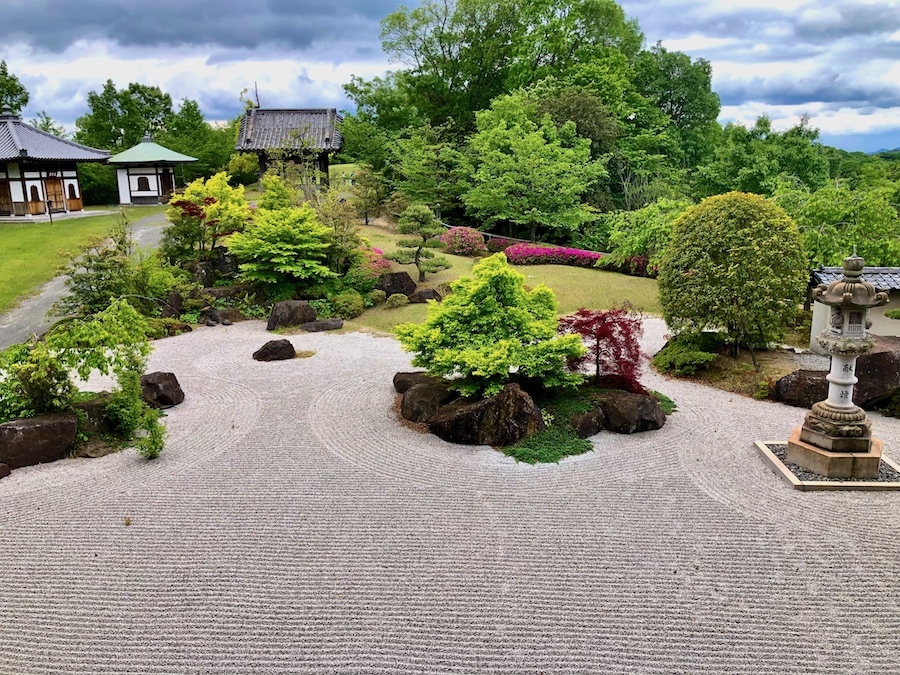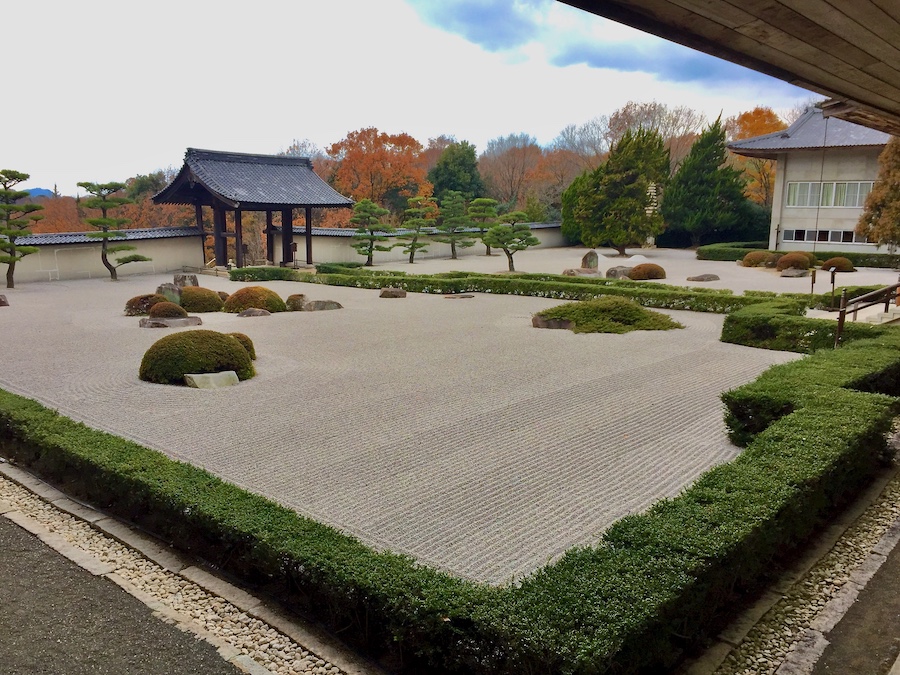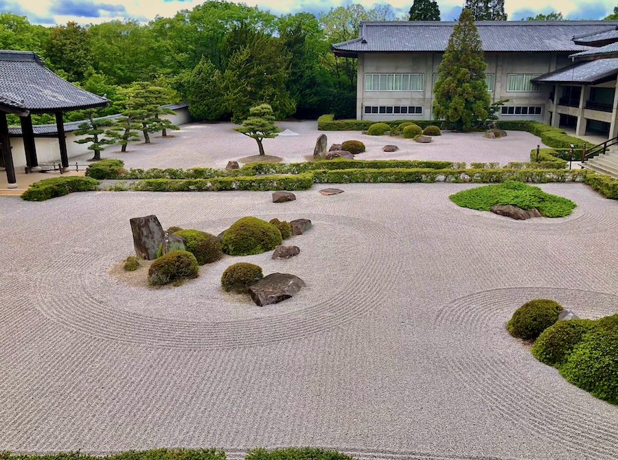 白砂で表現された大海?は一面の空と一体化し、その中に岩やサツキの刈込、ビャクシンによる島、山が配されている壮大な禅の庭。(“日本で最大の石庭”と呼ばれるものが国内には数箇所あり、その時代時代で一番だったからそうなっているのだけど、ここもその一つ。)