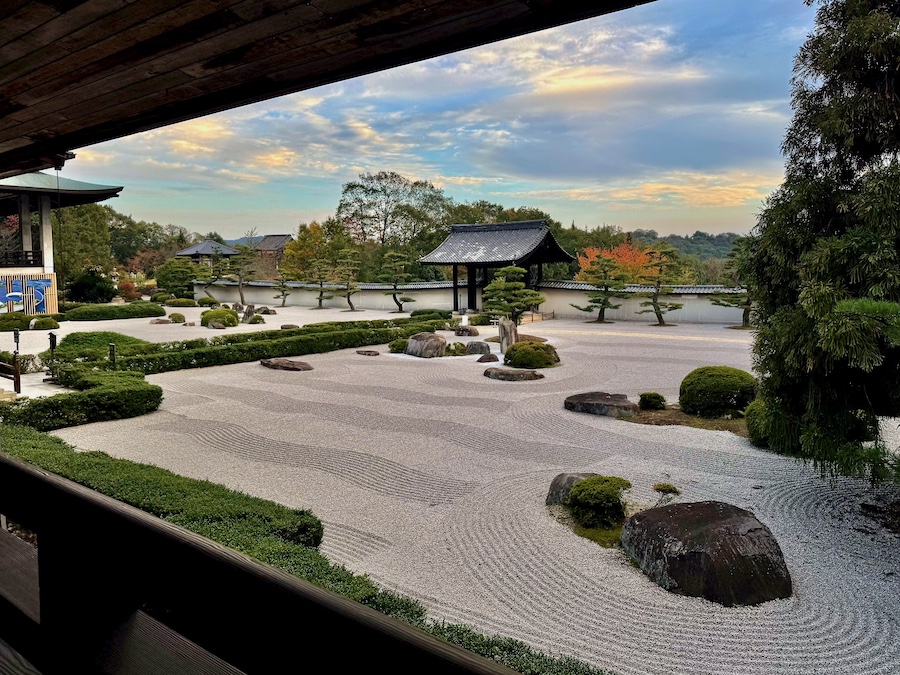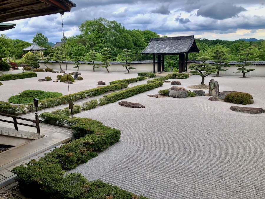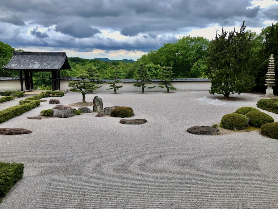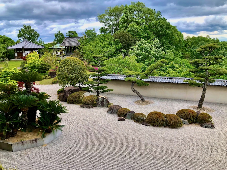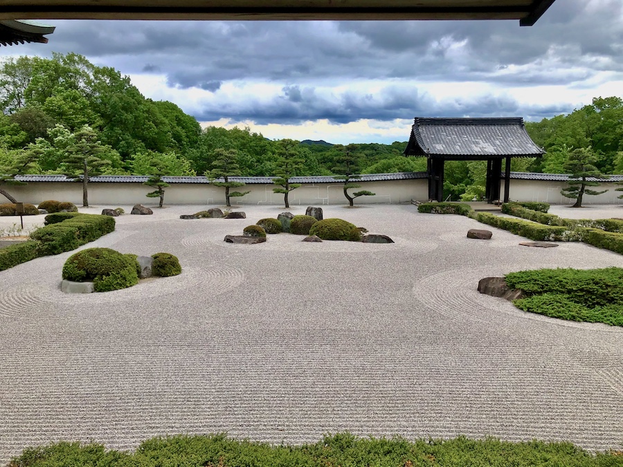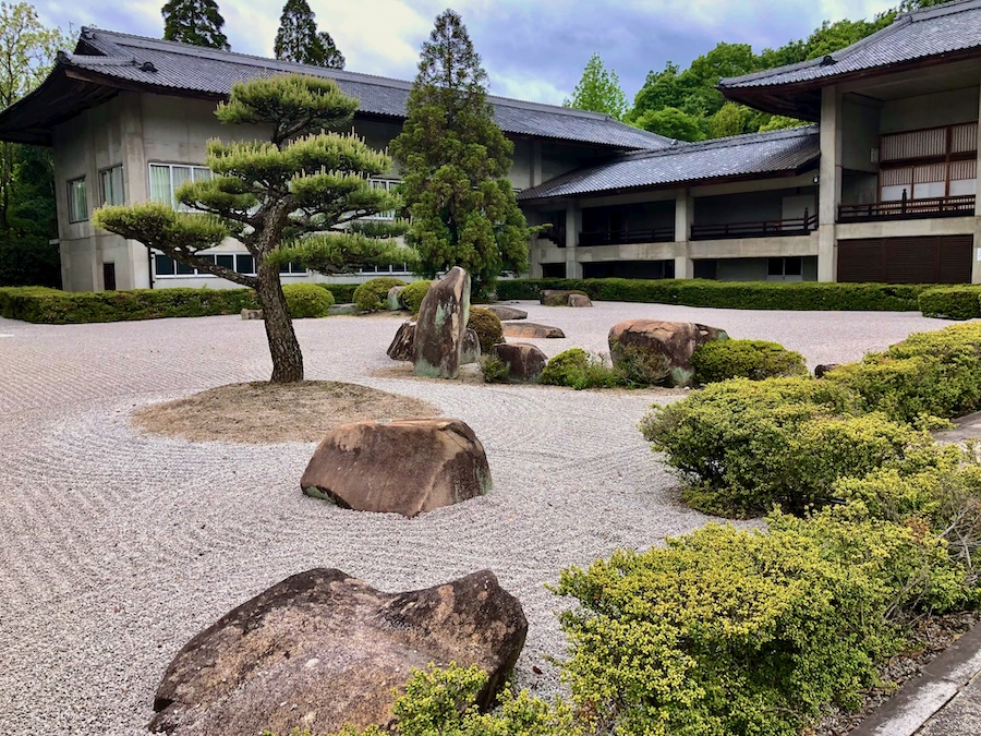 白砂で表現された大海?は一面の空と一体化し、その中に岩やサツキの刈込、ビャクシンによる島、山が配されている壮大な禅の庭。(“日本で最大の石庭”と呼ばれるものが国内には数箇所あり、その時代時代で一番だったからそうなっているのだけど、ここもその一つ。)