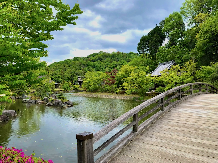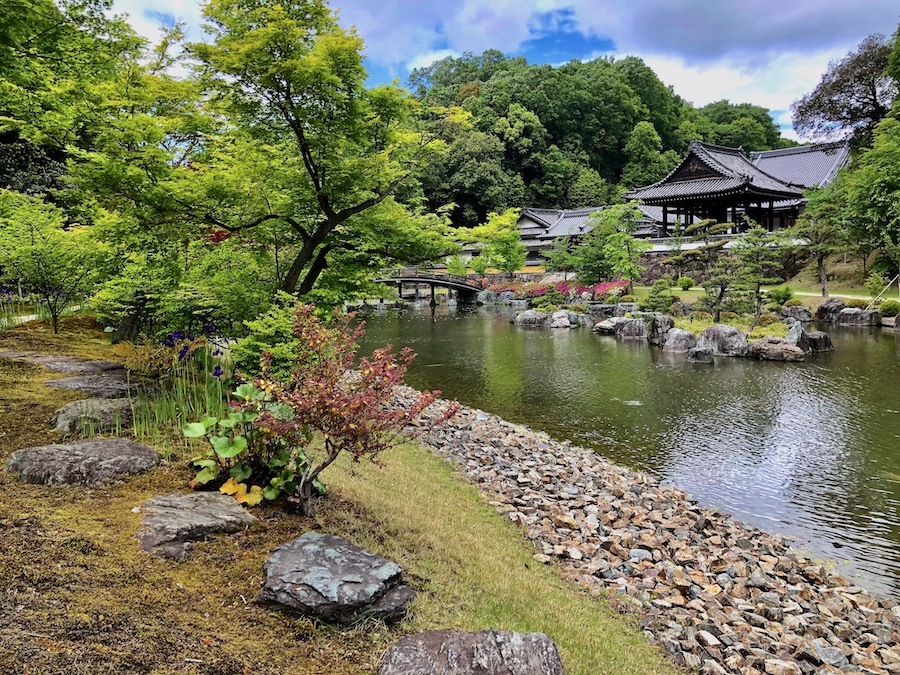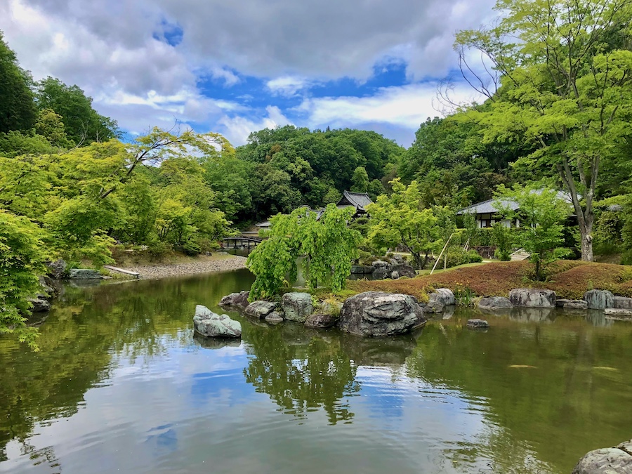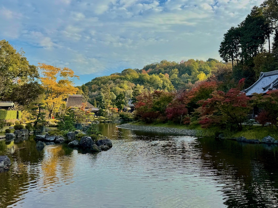 池のほとりに点在するお堂もそれぞれ由緒あるもの。まず茅葺の「含空院」。茶房として利用されているこのお堂は滋賀の古刹『永源寺』から移築された江戸時代初期の建築(永源寺にも現在は新たな「含空院」があります)。