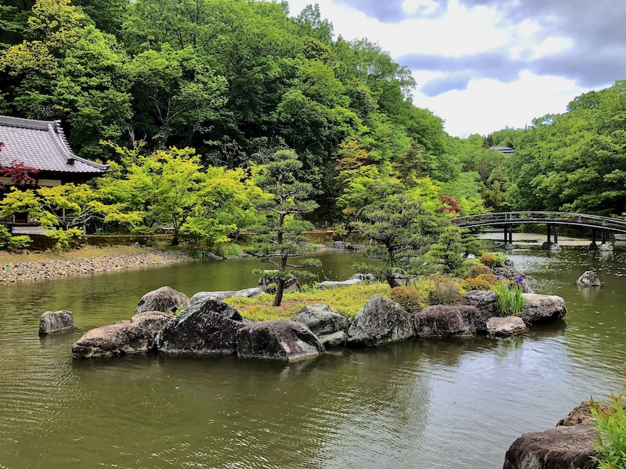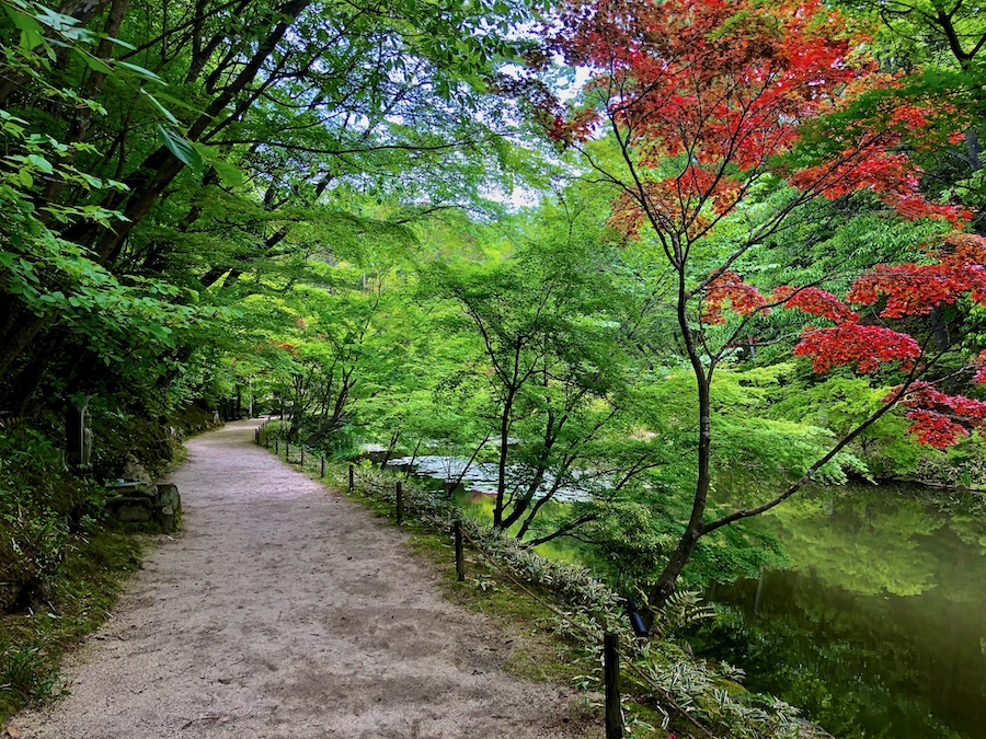 仏教の神仙思想が表現された庭園。縦長ながら「心」の字を表した“心字池”の中には、総門から近い所には宝船を表現した舟石、奥に向かうにつれ不老不死の仙人の住む神仙島(蓬莱島・瀛州島・方丈島)に見立てた島が浮かびます。そして、その池に水を流し込む大滝が“龍華の滝”。その向こうに先述の多宝塔がそびえます。池泉の周囲にはモミジが多く植栽され、新緑の季節や秋の紅葉の時期は特に美しい…。夏にはハスの花も。