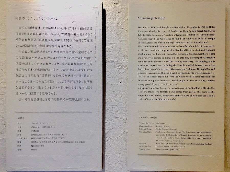 寺院としての歴史はとても新しく、創建は1965年(昭和40年)。福山市にある造船メーカー大手・常石造船で社長をつとめた実業家・神原秀夫が京都『建仁寺』から臨済宗建仁寺派七代管長・竹田益州老大師を開山に招き建立されました(開基は神原秀夫さん)。その寺号は氏の父親で常石造船/ツネイシホールディングスの創業者にあたる神原勝太郎さんの名にちなんだもの。神原家のルーツは菅原道真の末裔とも言われるそうで、江戸時代から“潮待ちの港”としても栄えた福山の海沿いで海運業などを営んでいました。ちなみにこの一帯には常石グループの経営するレジャー施設『みろくの里』や温泉、サッカー場(ツネイシフィールド)も。