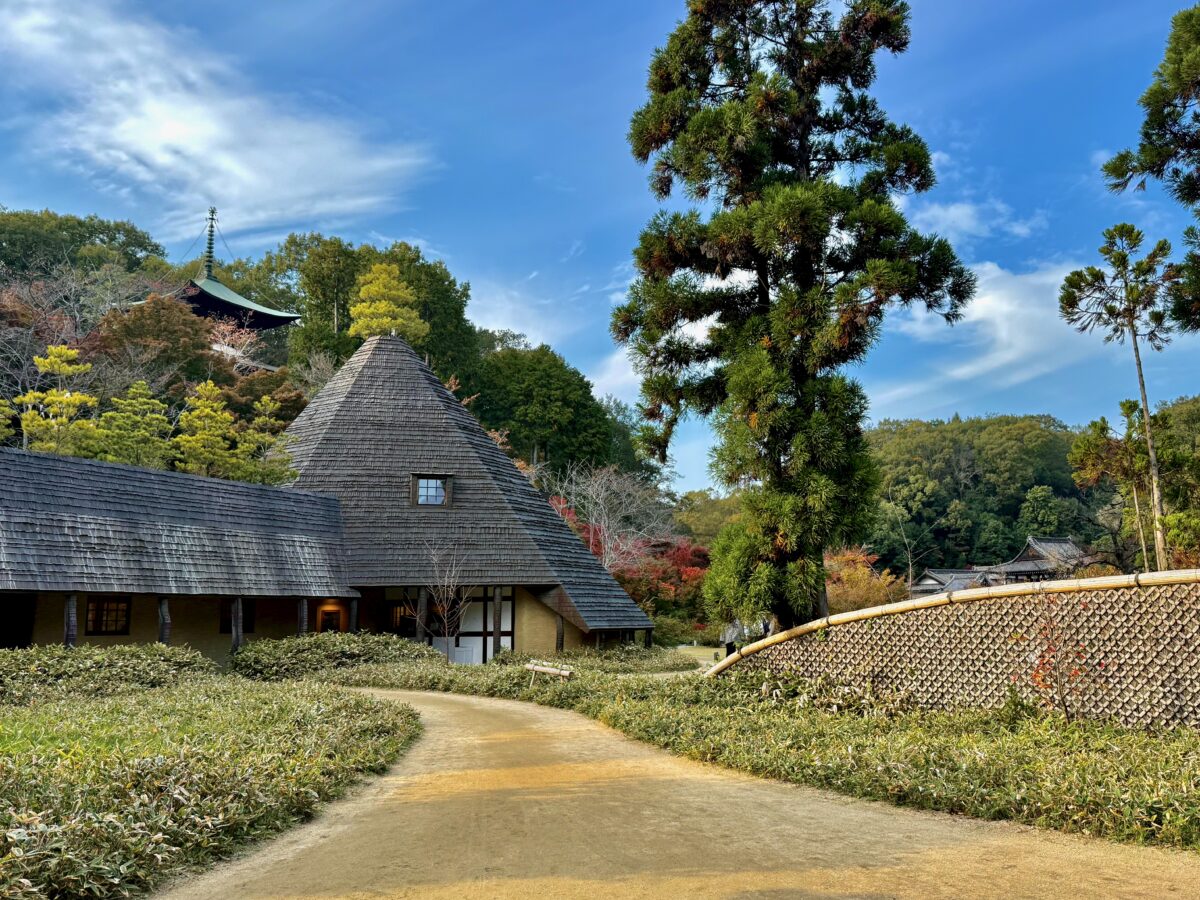かつて『京都御所』(御苑)内にあった皇族『旧賀陽宮邸』の門が移築された総門から入寺すると――高台部に見える多宝塔は伝統的な寺院建築ですが、その手前には変わった(特徴的な)トンガリ屋根の建築が視界に。