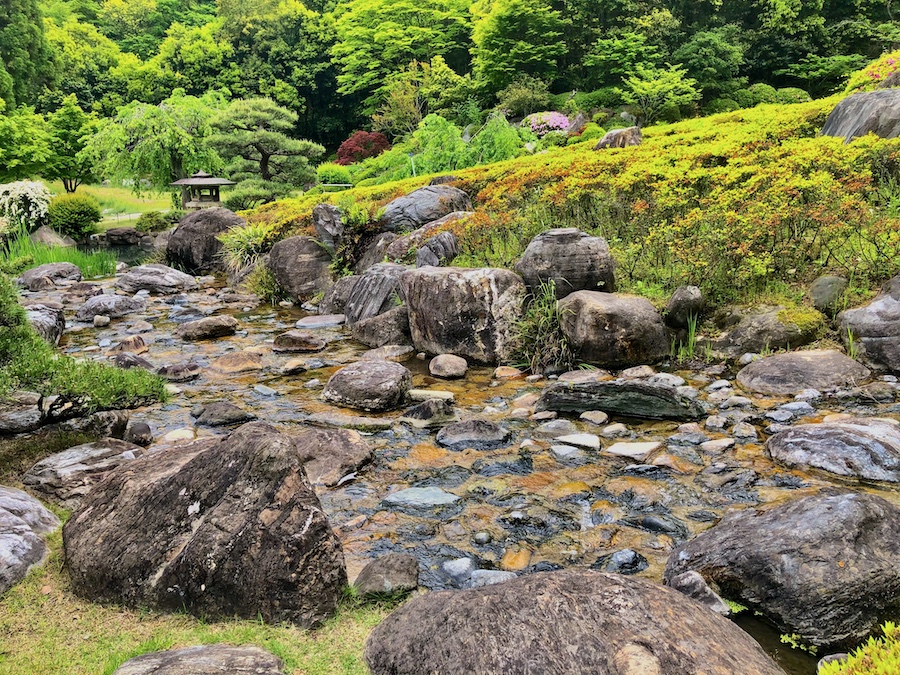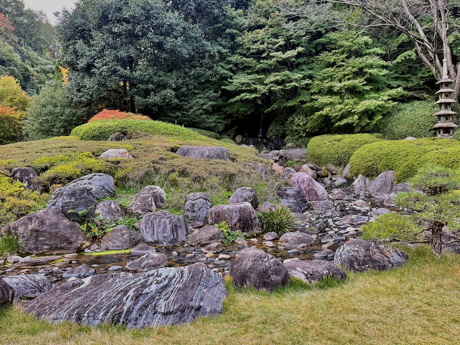 築山の中から流れ込む小川を眺め見る場所にある、ストライプが描かれた自然石が、名和晃平さんのシリーズ『Direction』の庭石バージョン…の様にも感じられる(その模様が描かれた庭石がいくつかある)。SANDWICHファンには日本庭園の“石”に注目してもらいたい、そんな庭園!