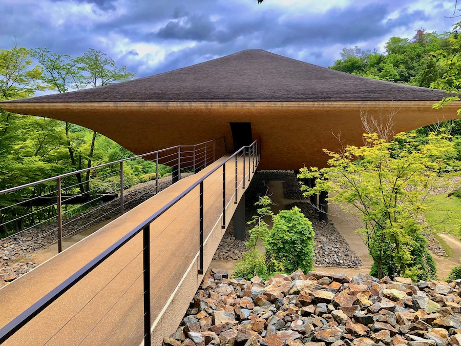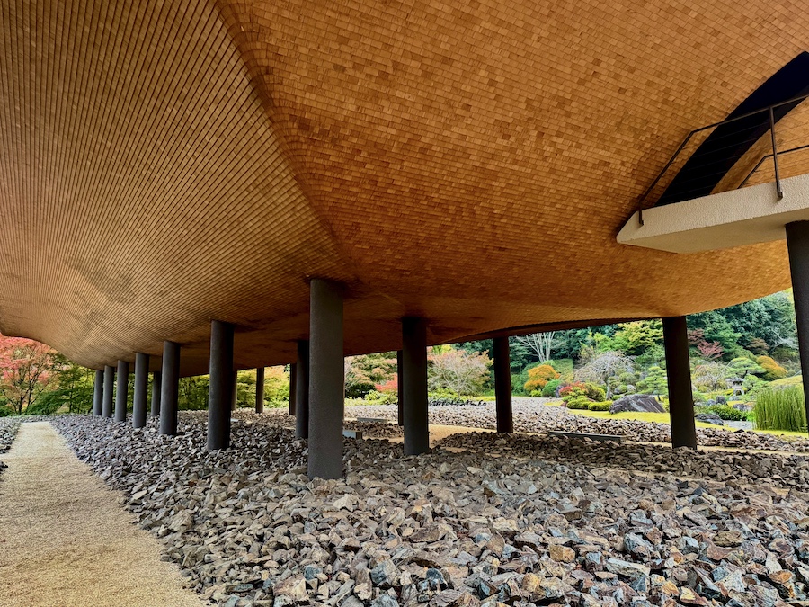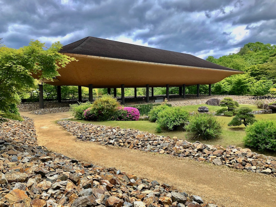 禅と庭のミュージアムで最初に来場者/拝観者を迎えてくれる日本庭園『賞心庭』、その頭上にそびえる多宝塔…そしてまるでフィナンシェのような…?いや舟型の建築、これが禅と庭のミュージアムのアート・パヴィリオン《洸庭》。